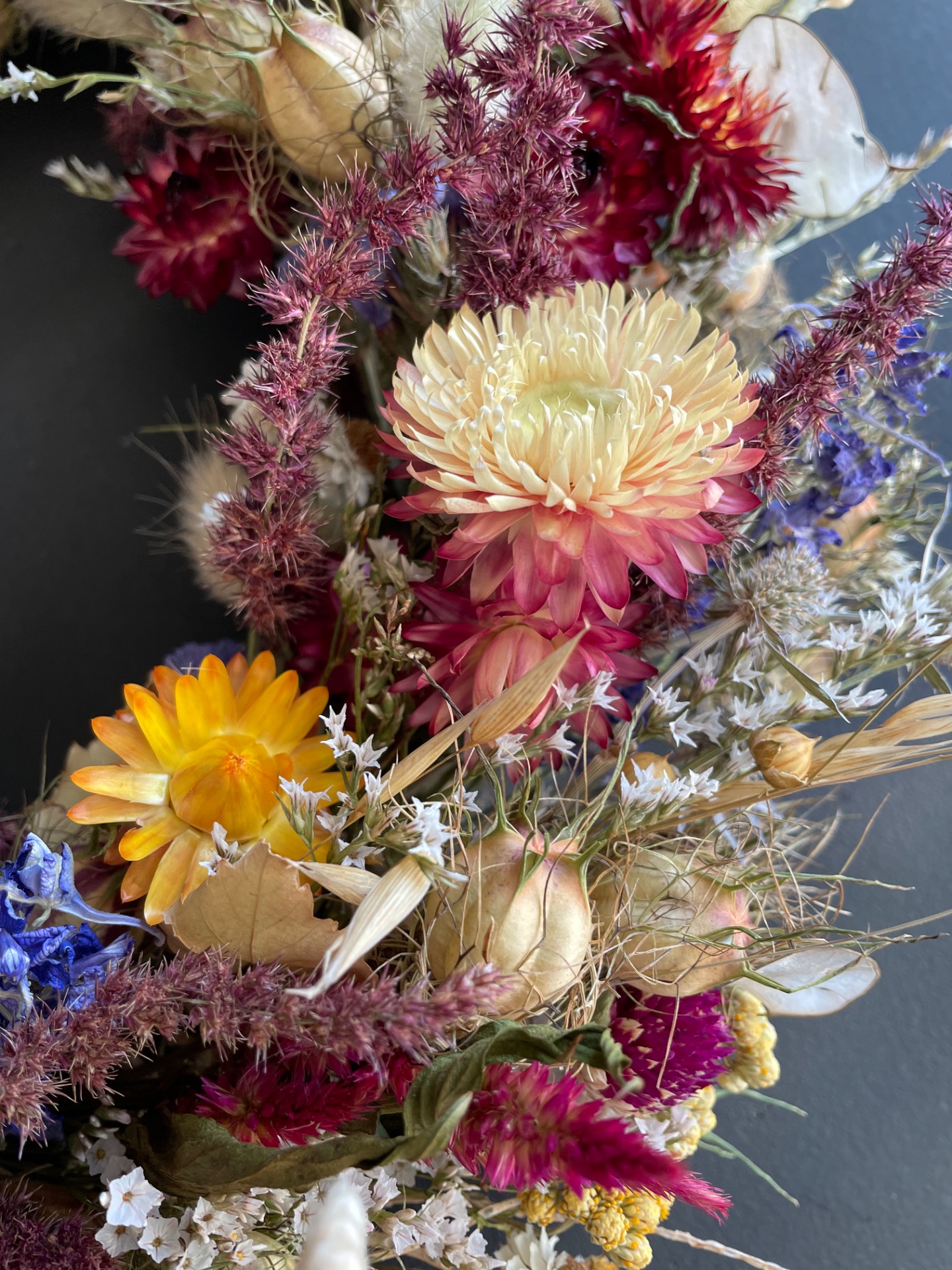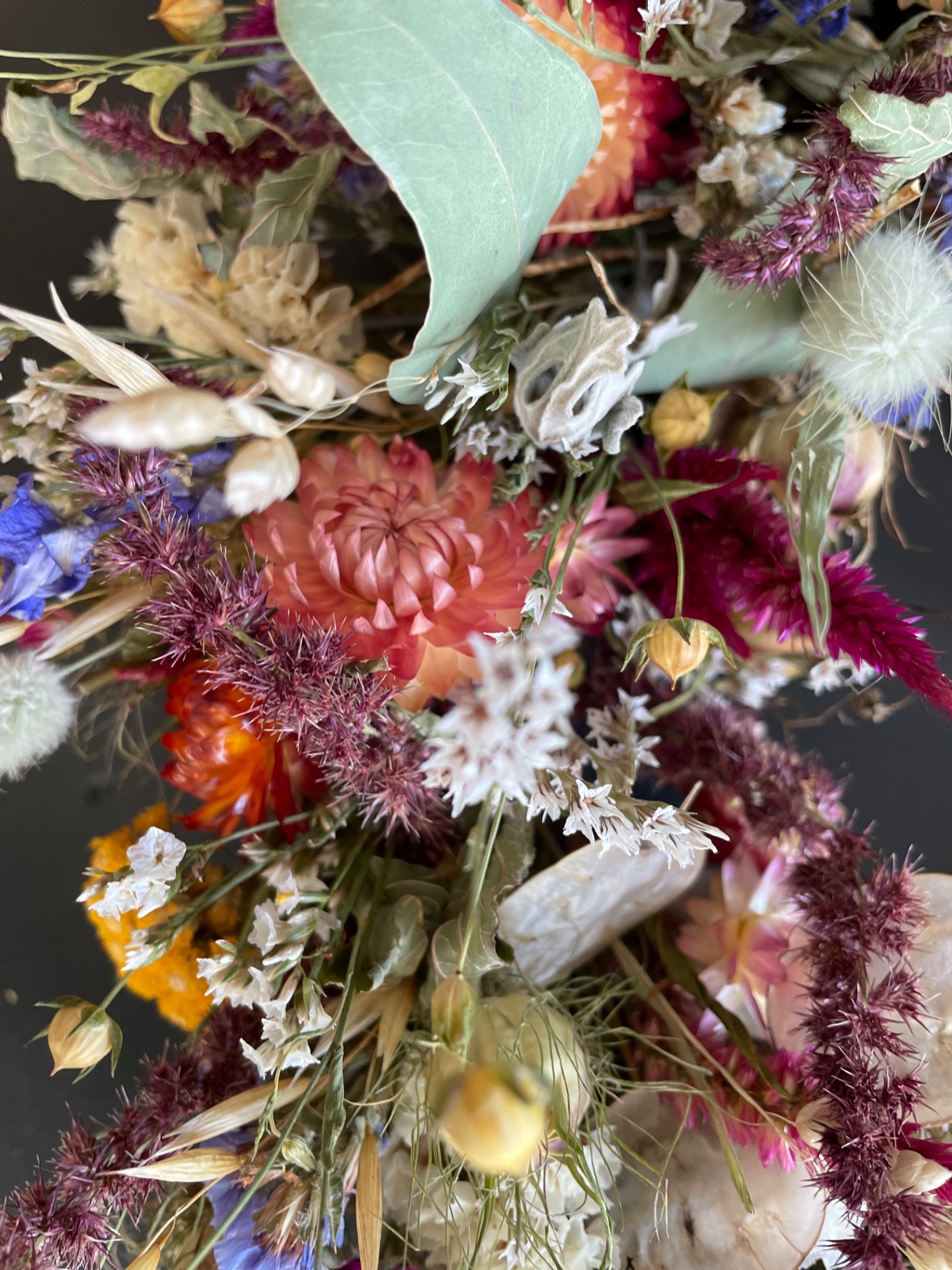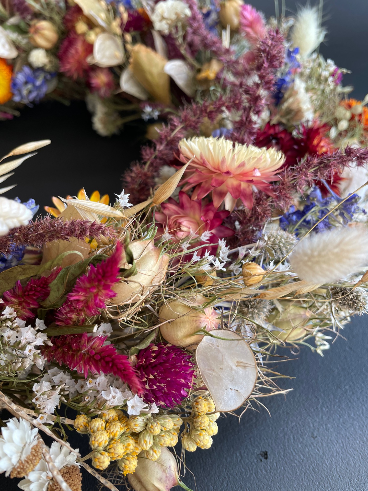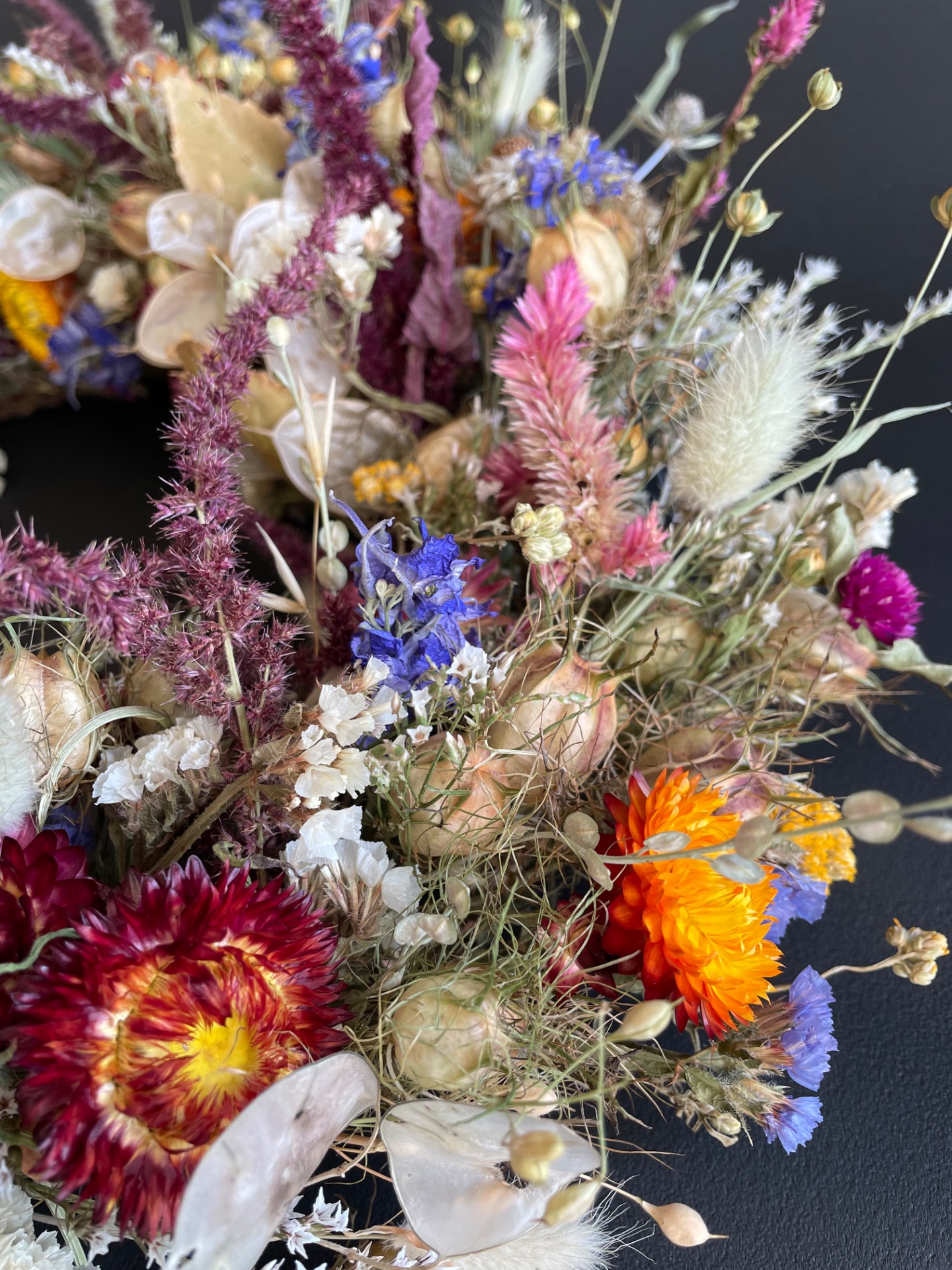 Prírodné rastliny: Použité rastliny vo venčeku sú vypestované na mojej kvetinovej farme a nazbierané v okolitej prírode. Každý kvet a vetvička je prirodzená, bez použitia umelých prvkov, farieb, či lepidiel. Nájdete v ňom tieto rastliny: limonku, slamienky, piesočník, ostôžku, plameník, ľan, kotúč modrastý, mesačnicu ročnú, limonku tatársku, japonskú limonku, ovos, kapsičku attraxu, traslicu, zajačí chvostík, eukalyptus, černušku a žlté agerátum.