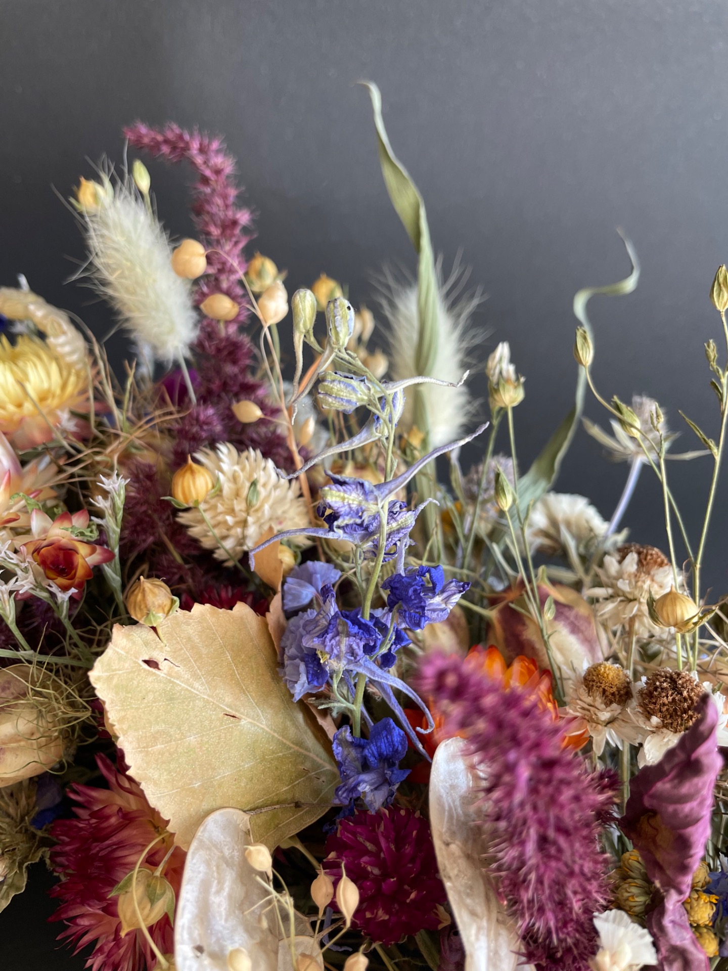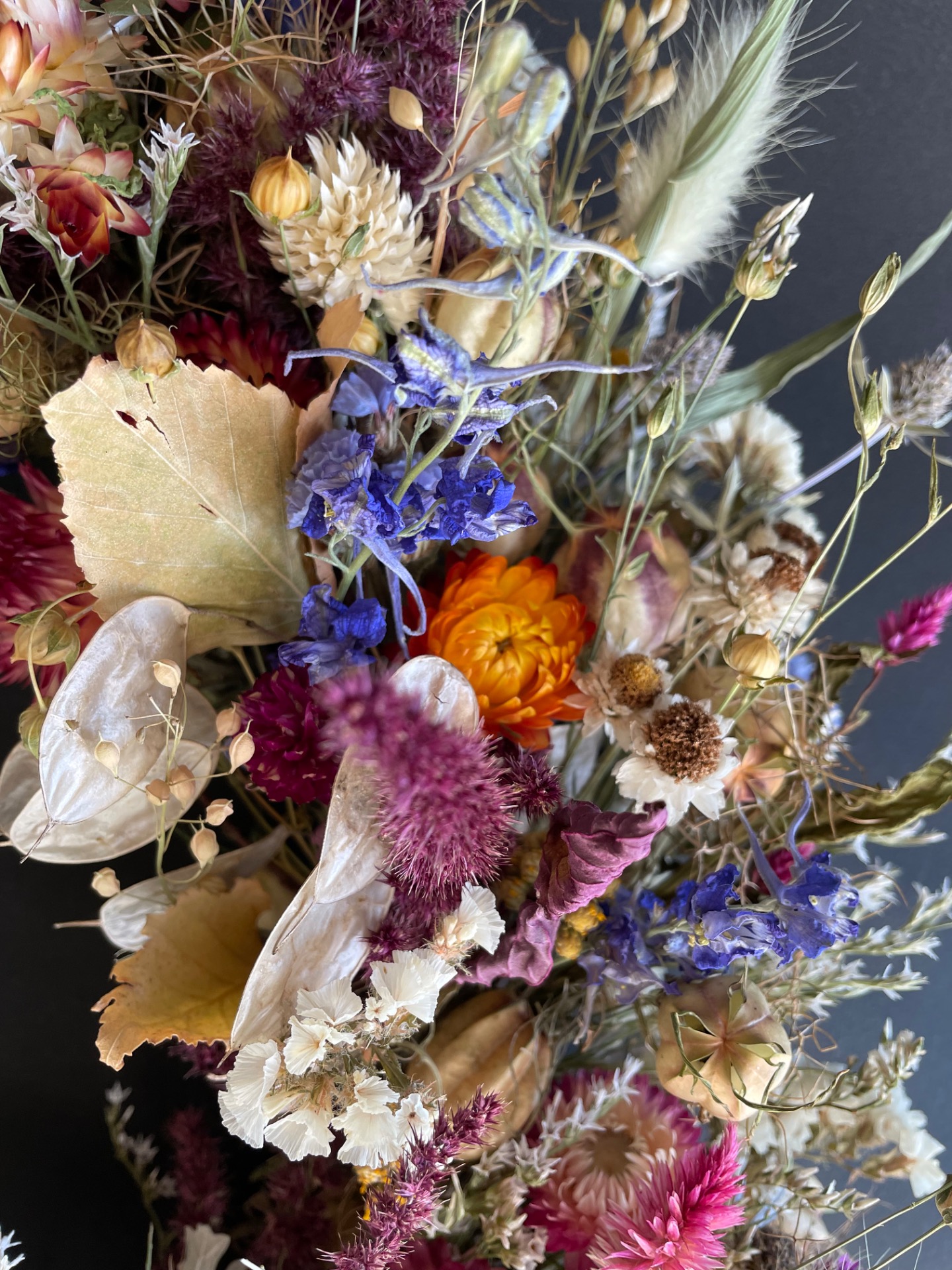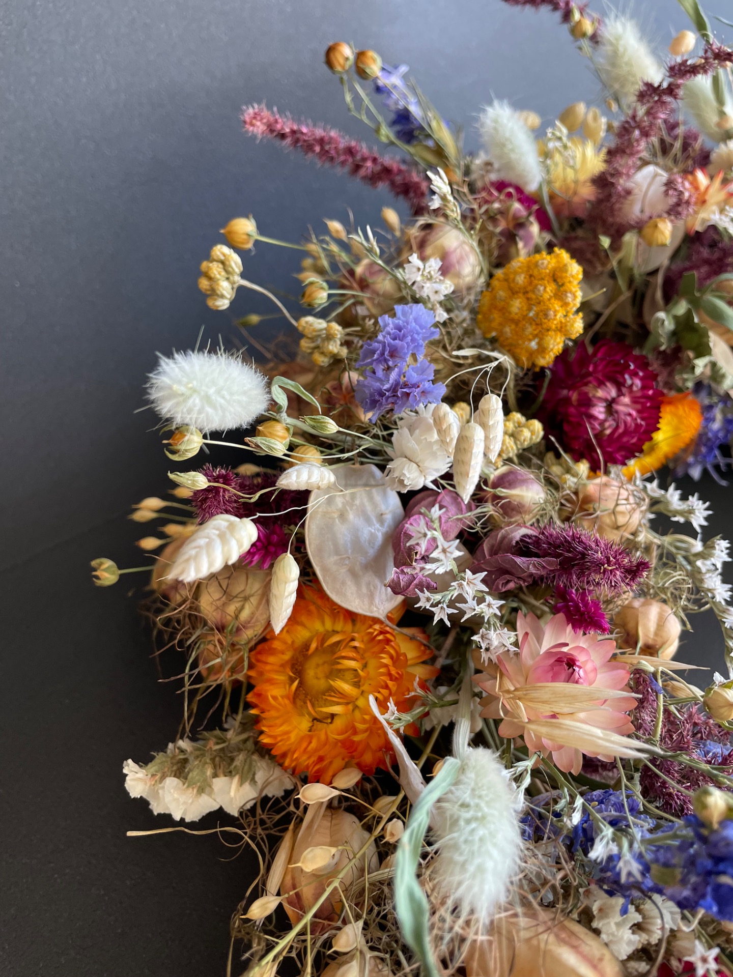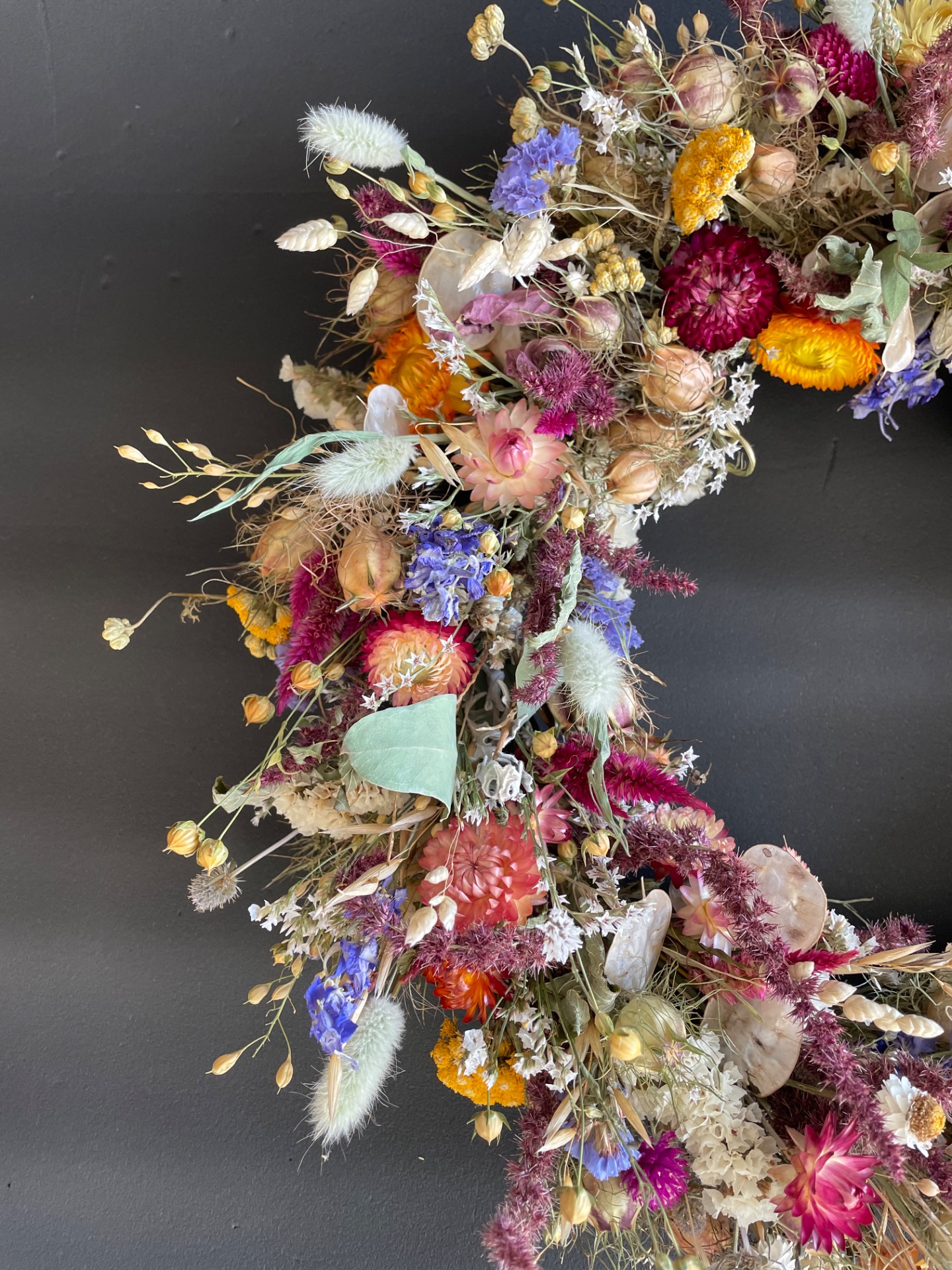 Prírodné rastliny: Použité rastliny vo venčeku sú vypestované na mojej kvetinovej farme a nazbierané v okolitej prírode. Každý kvet a vetvička je prirodzená, bez použitia umelých prvkov, farieb, či lepidiel. Nájdete v ňom tieto rastliny: limonku, slamienky, piesočník, ostôžku, plameník, ľan, kotúč modrastý, mesačnicu ročnú, limonku tatársku, japonskú limonku, ovos, kapsičku attraxu, traslicu, zajačí chvostík, eukalyptus, černušku a žlté agerátum.