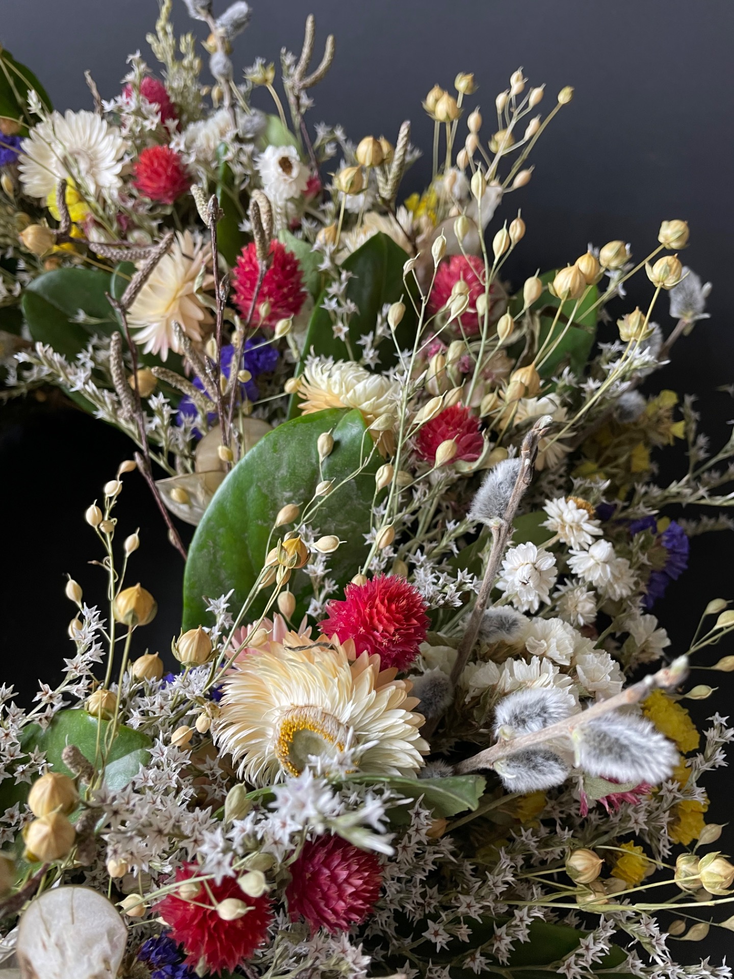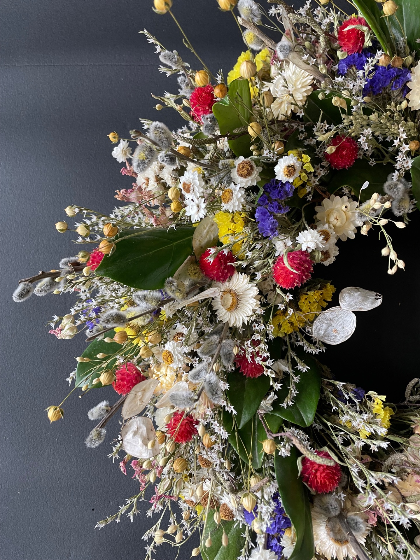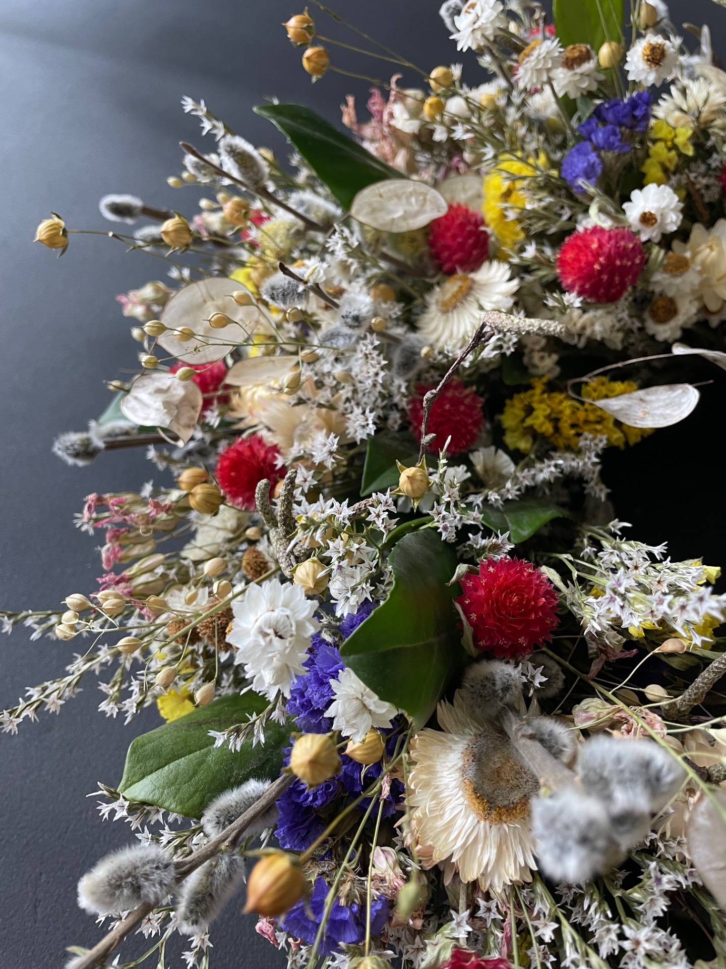 Prírodné rastliny: Použité rastliny vo venčeku sú vypestované na mojej kvetinovej farme. Každý kvet a vetvička je prirodzená, bez použitia umelých prvkov, farieb, či lepidiel. Nájdete v ňom tieto rastliny: limonku, slamienky, ľan, limonku tatársku, zelené halúzky, limonka suworova, mesačnica ročkná, bahniaťka, kapsička.