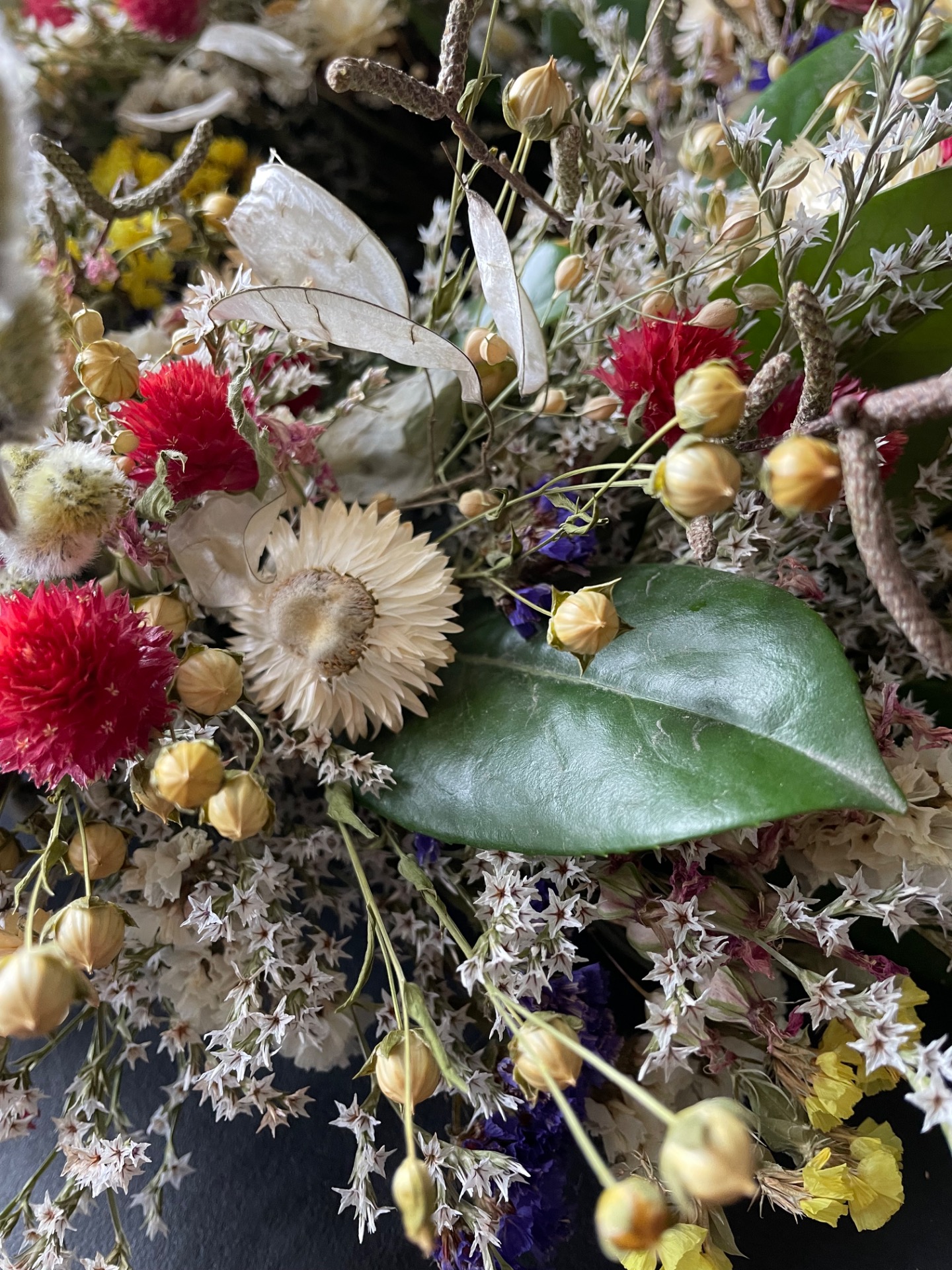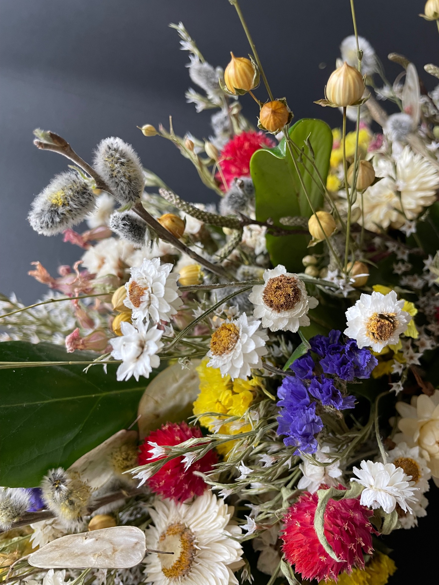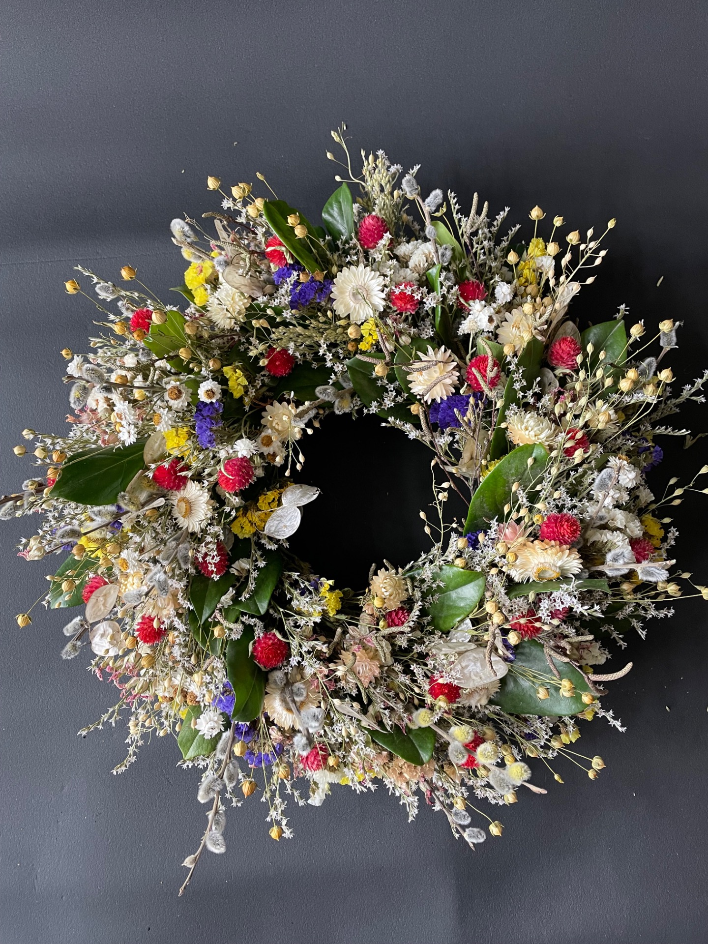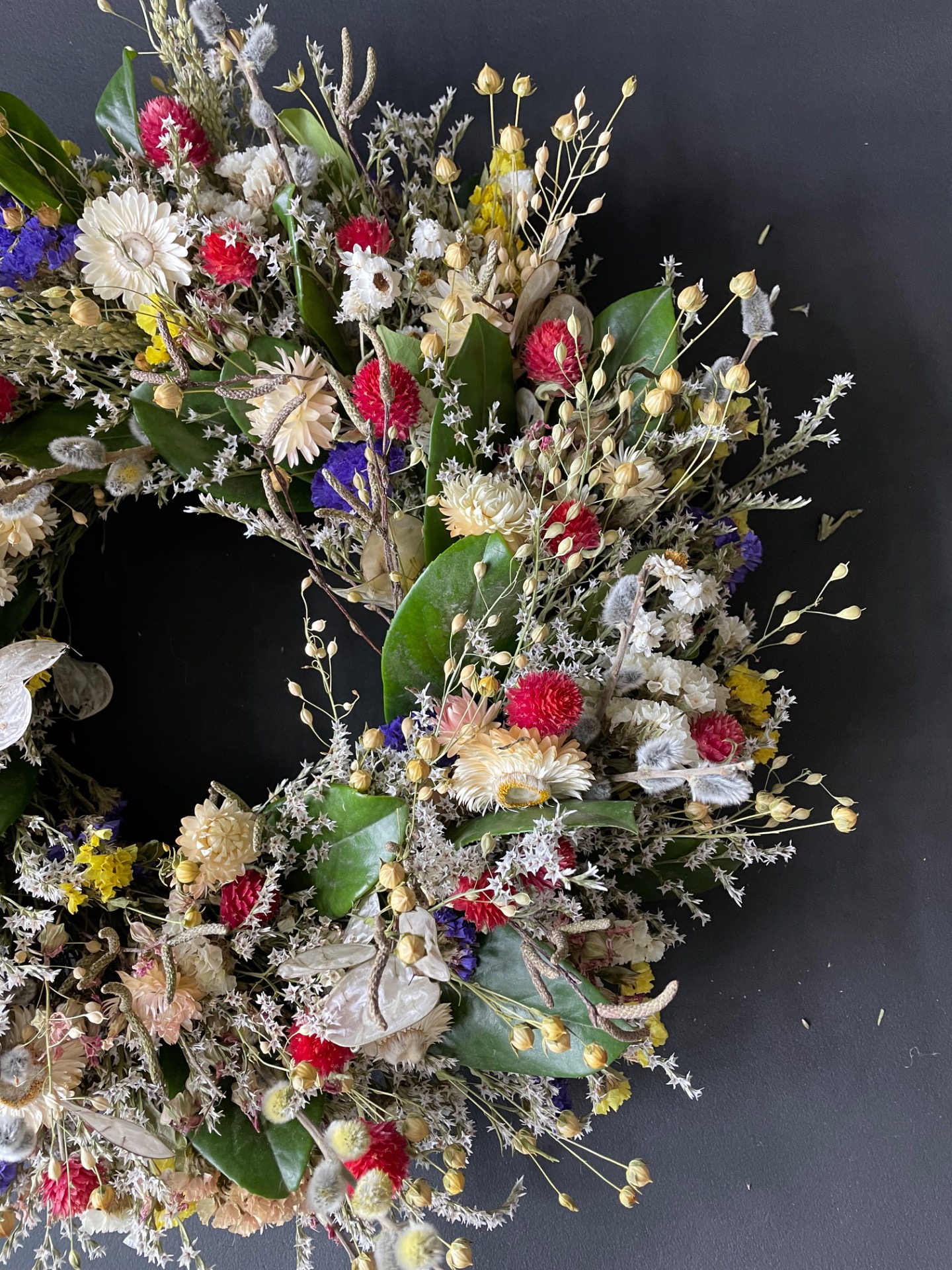 Prírodné rastliny: Použité rastliny vo venčeku sú vypestované na mojej kvetinovej farme. Každý kvet a vetvička je prirodzená, bez použitia umelých prvkov, farieb, či lepidiel. Nájdete v ňom tieto rastliny: limonku, slamienky, ľan, limonku tatársku, zelené halúzky, limonka suworova, mesačnica ročkná, bahniaťka, kapsička.