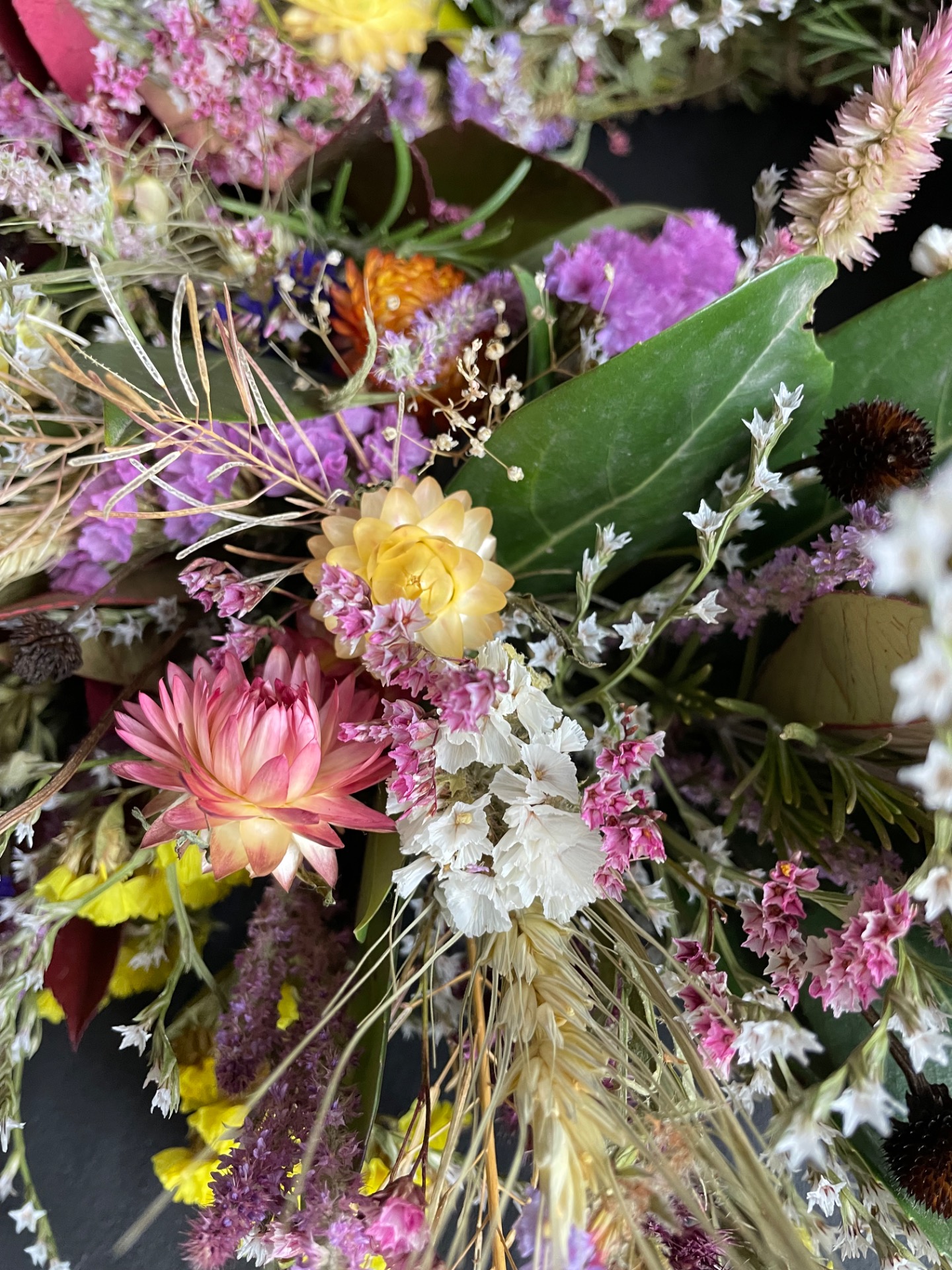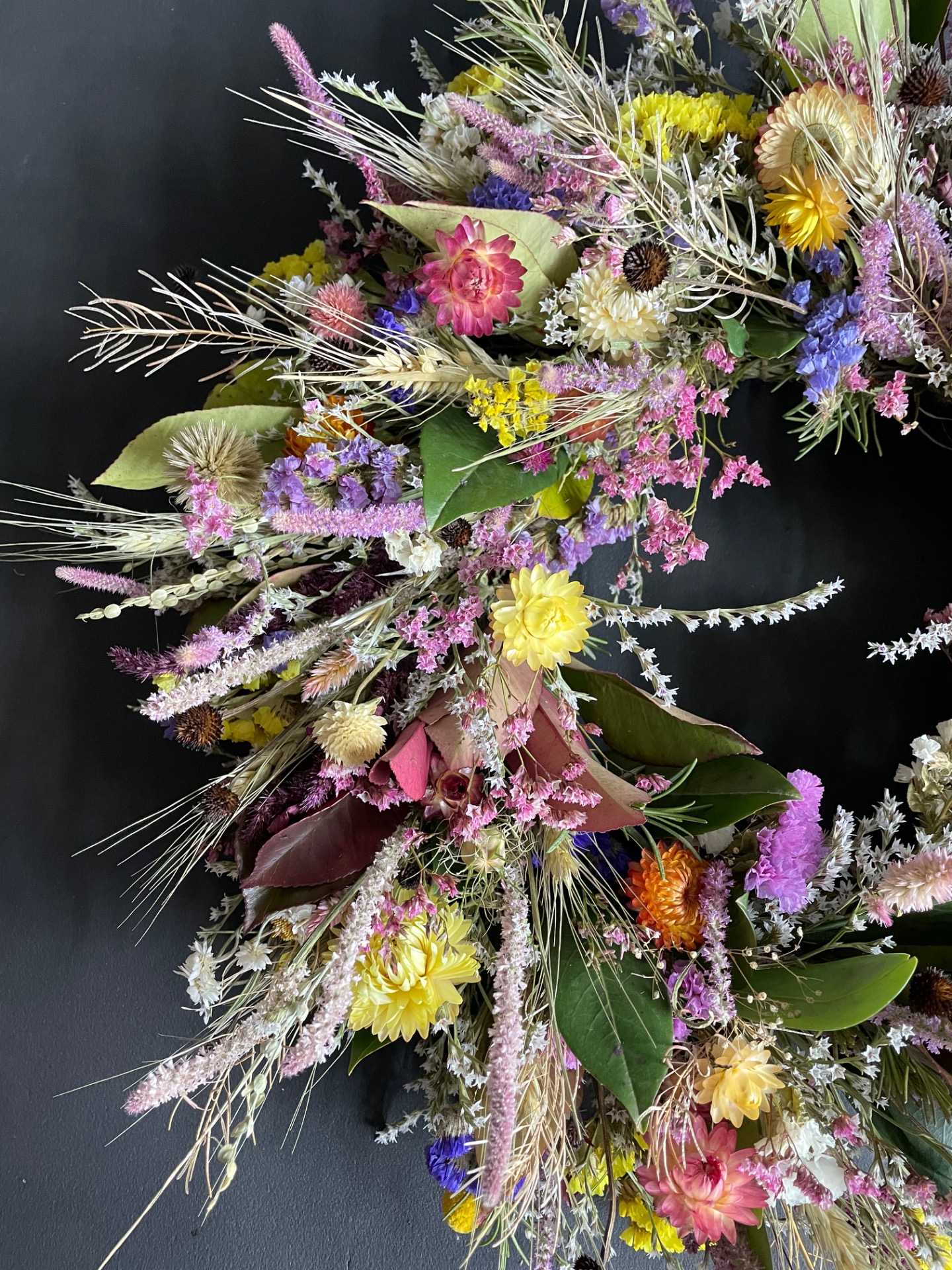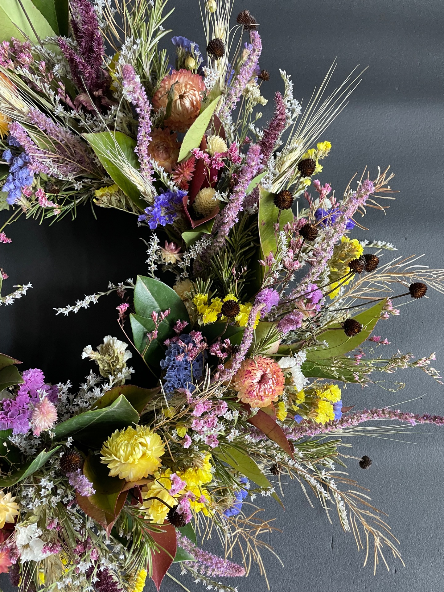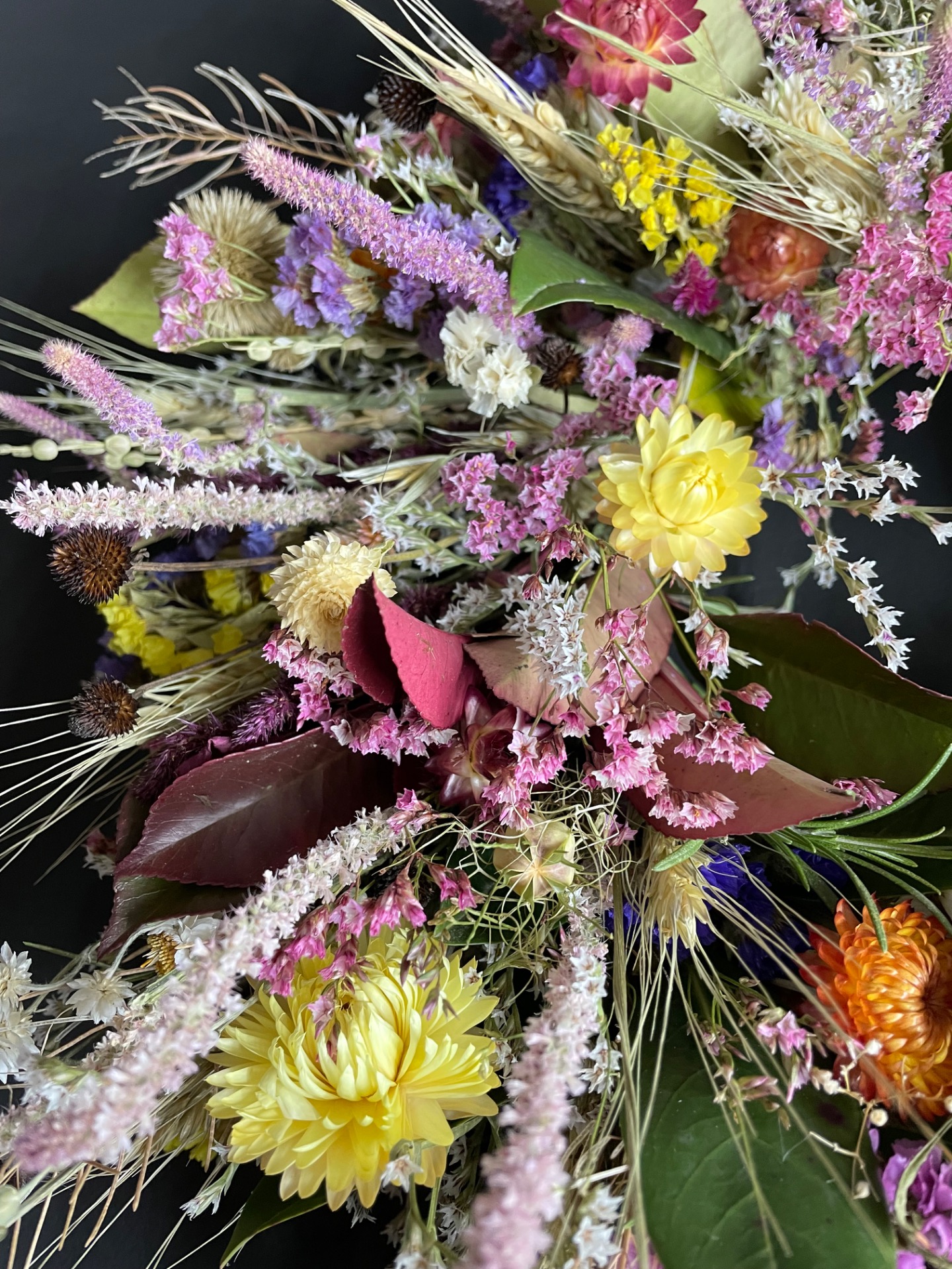 Prírodné rastliny: Použité rastliny vo venčeku sú vypestované na mojej kvetinovej farme. Každý kvet a vetvička je prirodzená, bez použitia umelých prvkov, farieb, či lepidiel. Nájdete v ňom tieto rastliny: limonku, slamienky, plameník, ľan, limonku tatársku, japonskú limonku, obilie, semenáče rudbekie, zelené halúzky, limonka suworova, úhorník a kraspédiu.