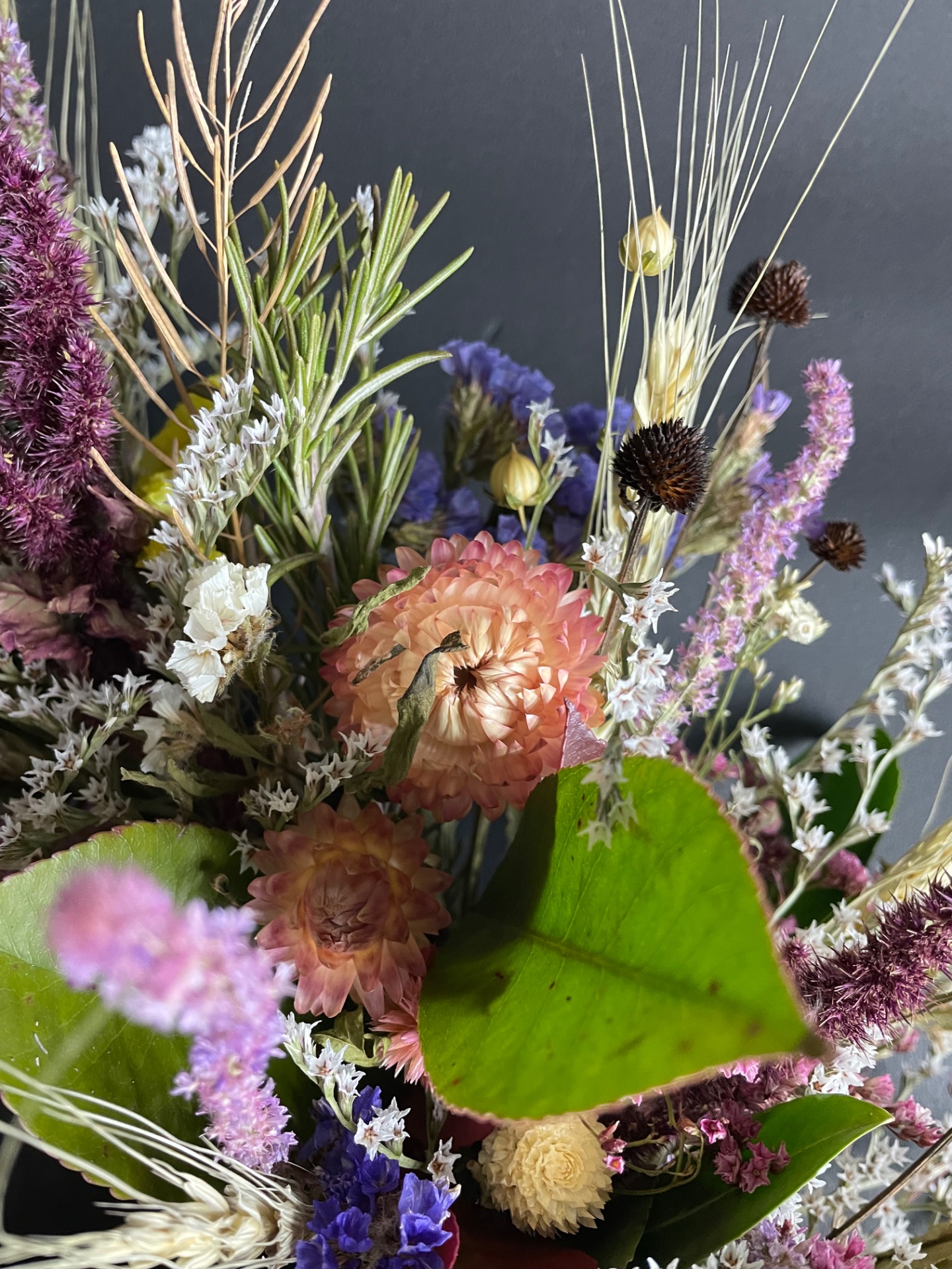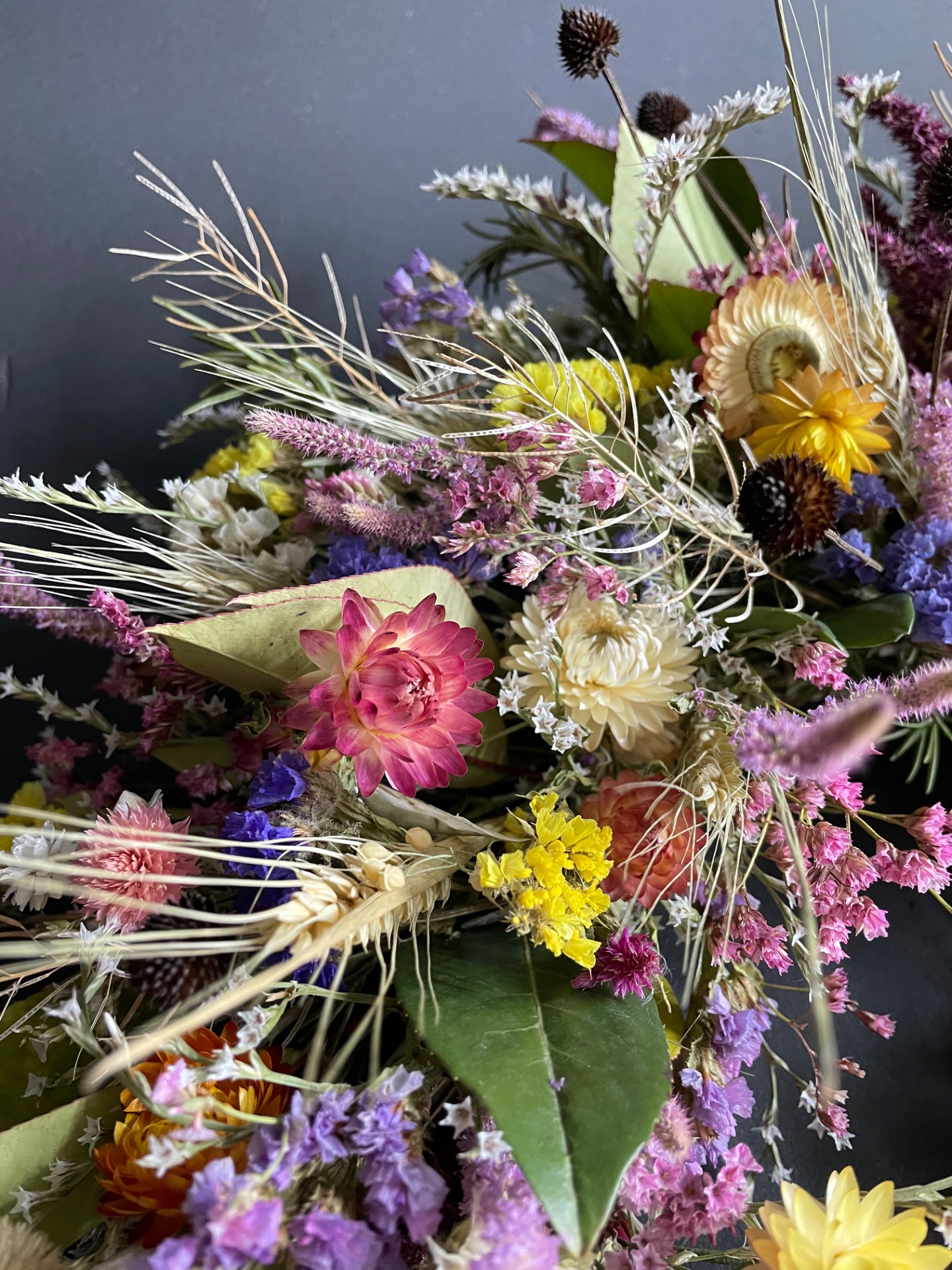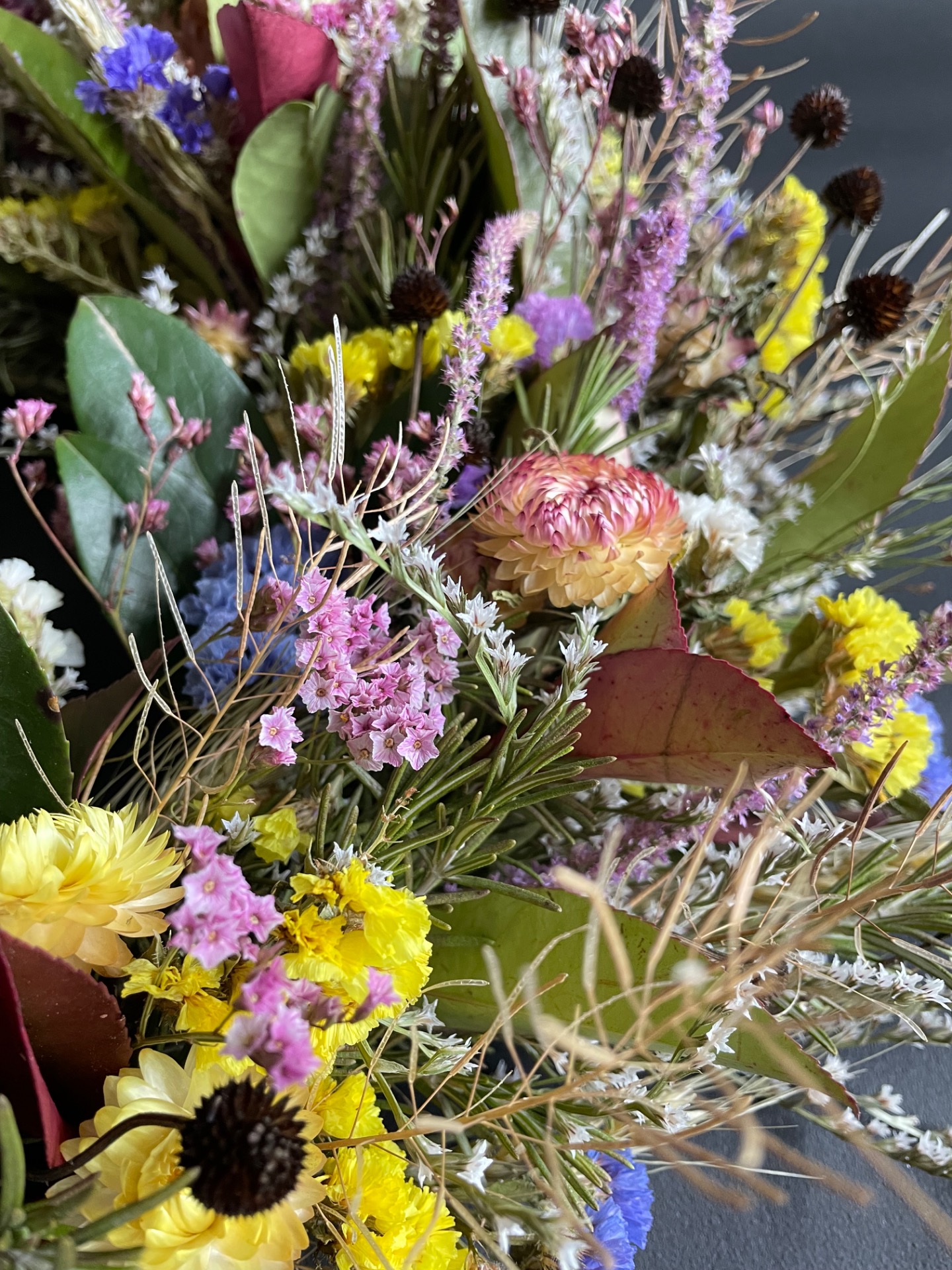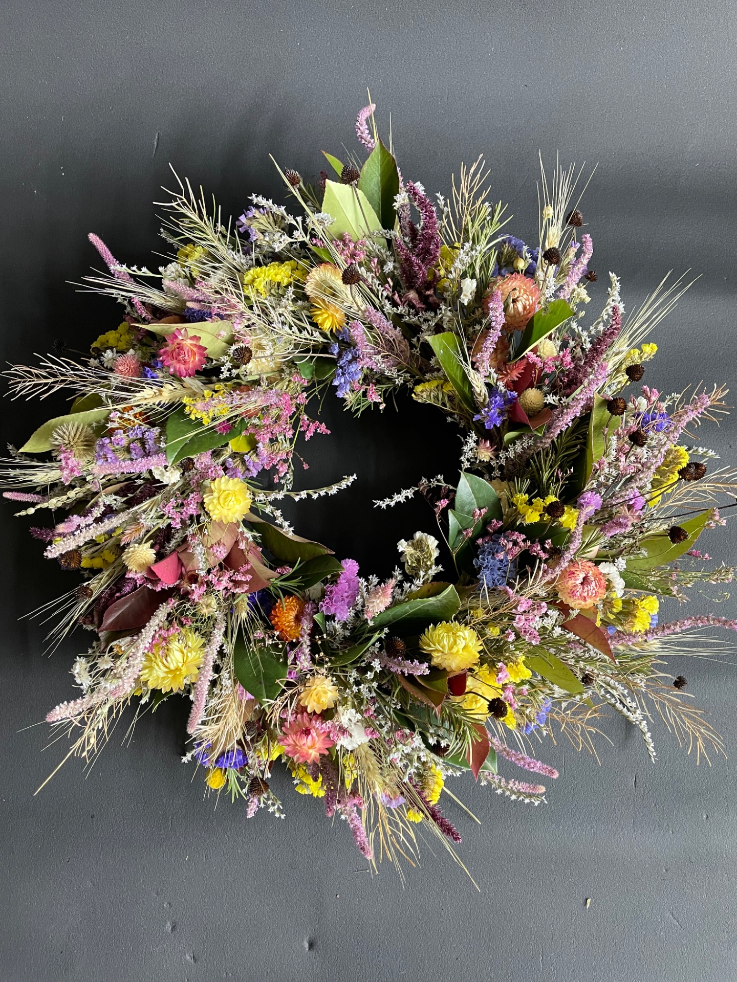 Prírodné rastliny: Použité rastliny vo venčeku sú vypestované na mojej kvetinovej farme. Každý kvet a vetvička je prirodzená, bez použitia umelých prvkov, farieb, či lepidiel. Nájdete v ňom tieto rastliny: limonku, slamienky, plameník, ľan, limonku tatársku, japonskú limonku, obilie, semenáče rudbekie, zelené halúzky, limonka suworova, úhorník a kraspédiu.