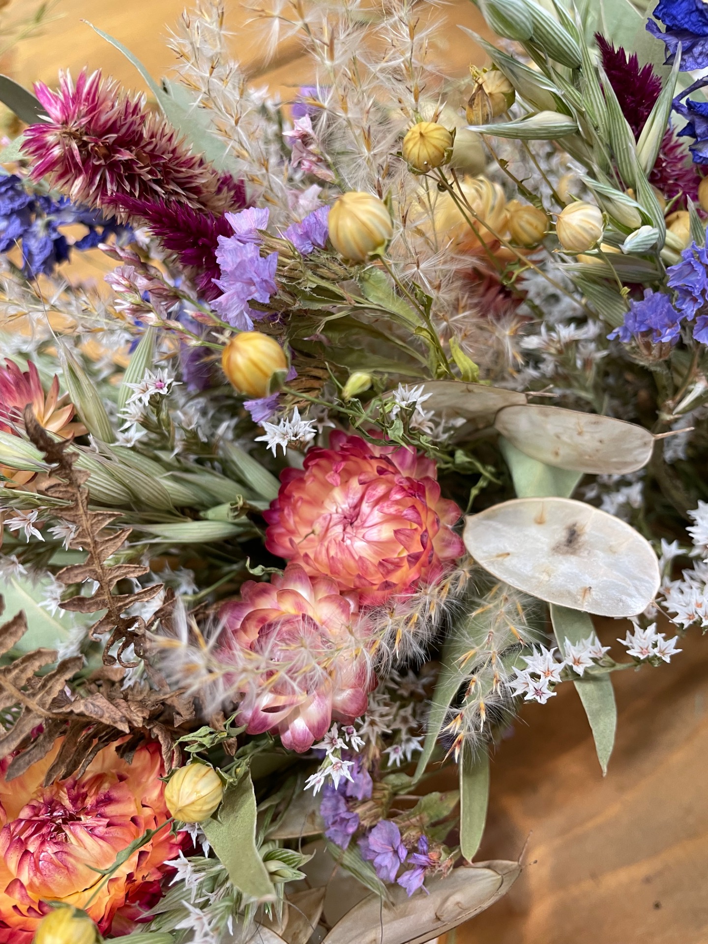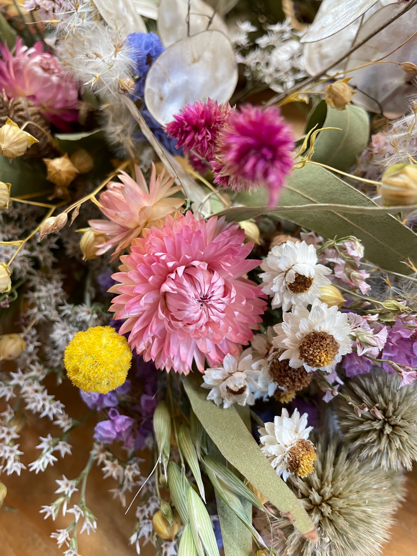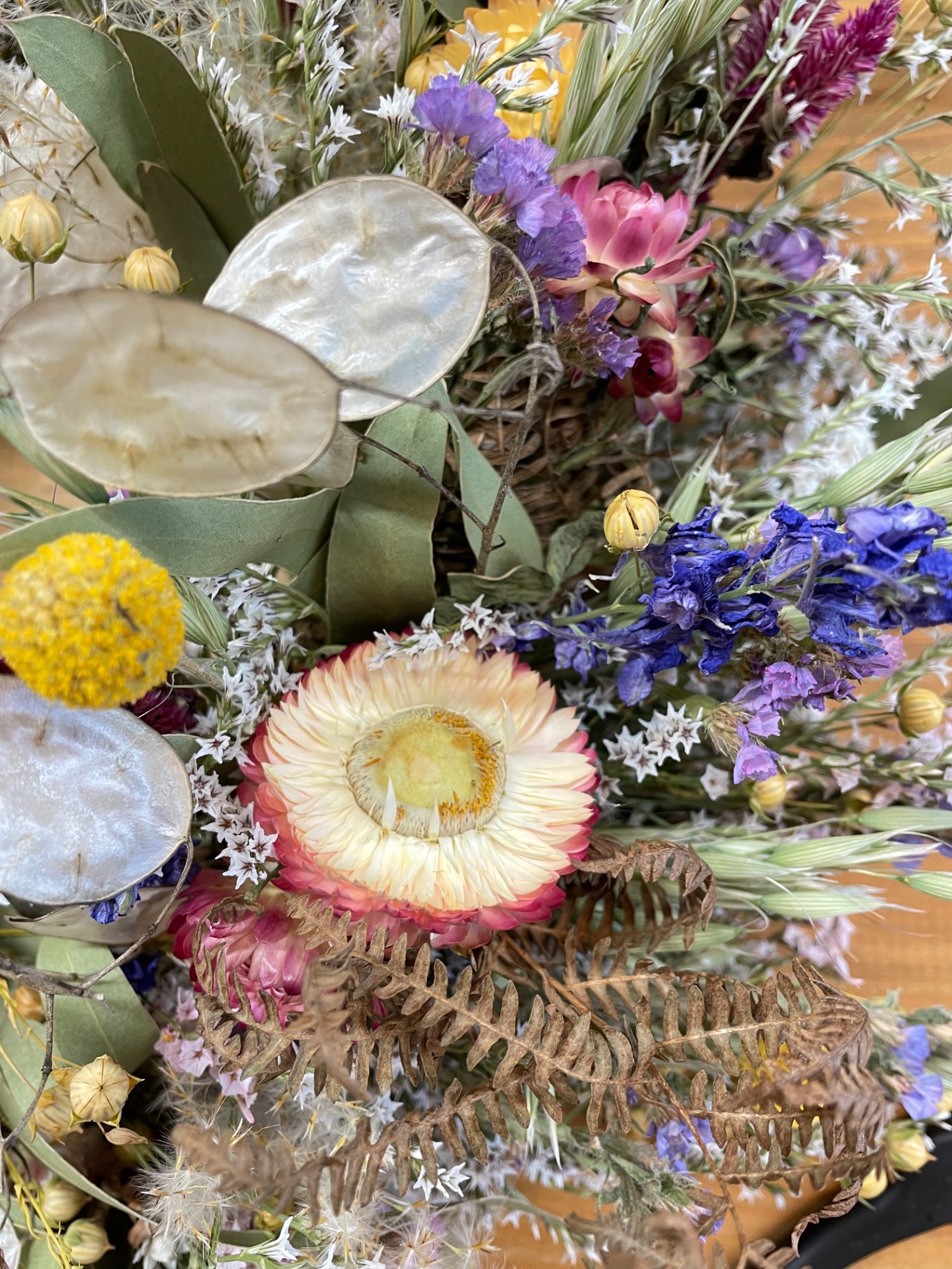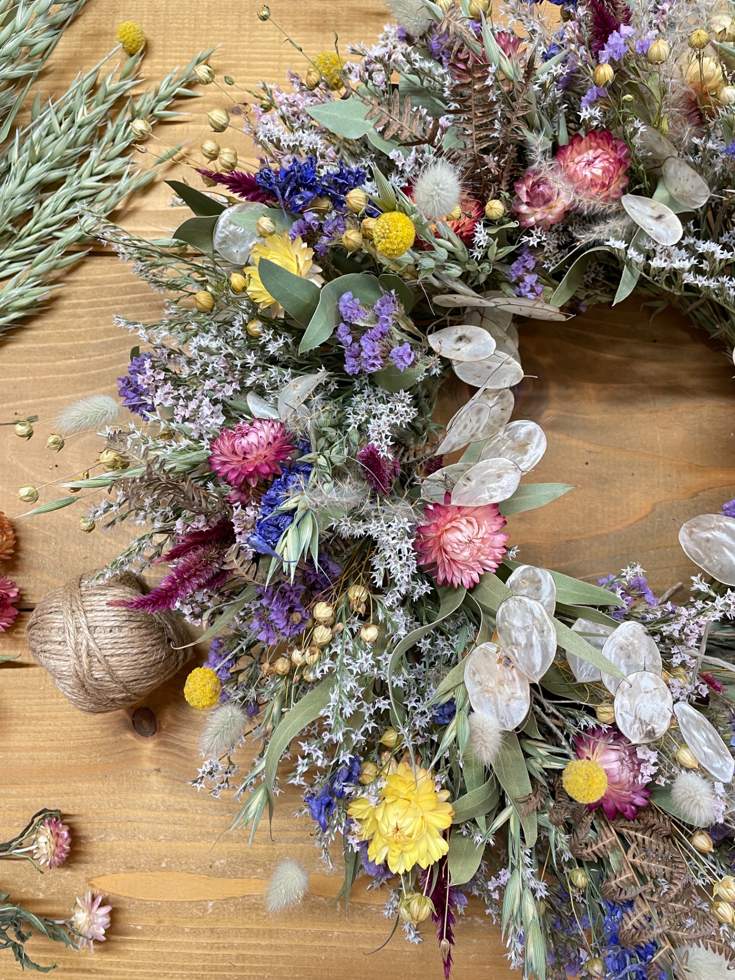Prírodné rastliny: Použité rastliny vo venčeku sú vypestované na mojej kvetinovej farme a nazbierané v okolitej prírode. Každý kvet a vetvička je prirodzená, bez použitia umelých prvkov, farieb, či lepidiel. Nájdete v ňom tieto rastliny: limonku, slamienky, piesočník, kraspédiu, ostôžku, celóziu, ľan, papraď, mesačnicu ročnú, limonku tatársku, okrasnú trávu, zajačí chvostík, eukalyptus a ovos.