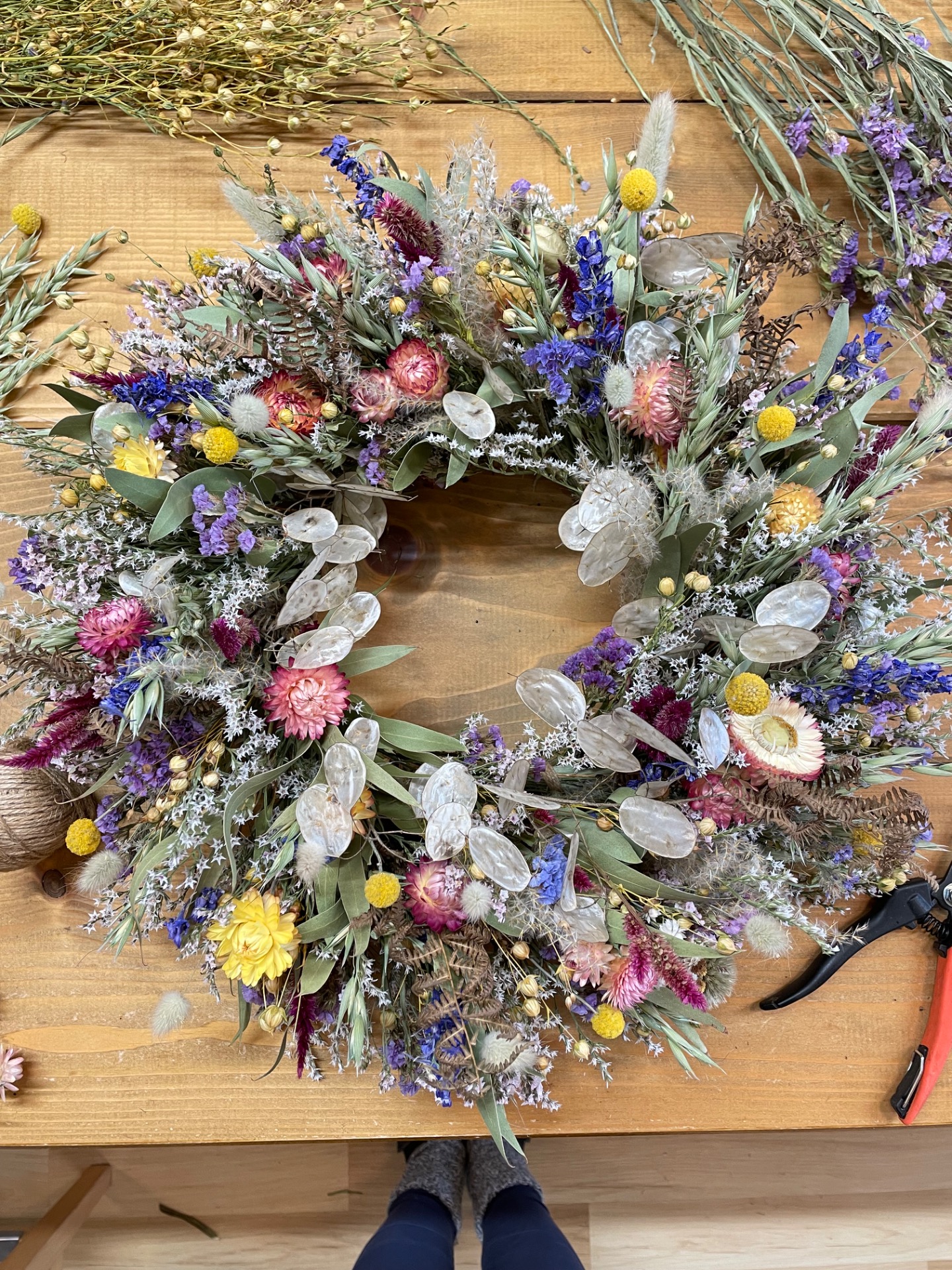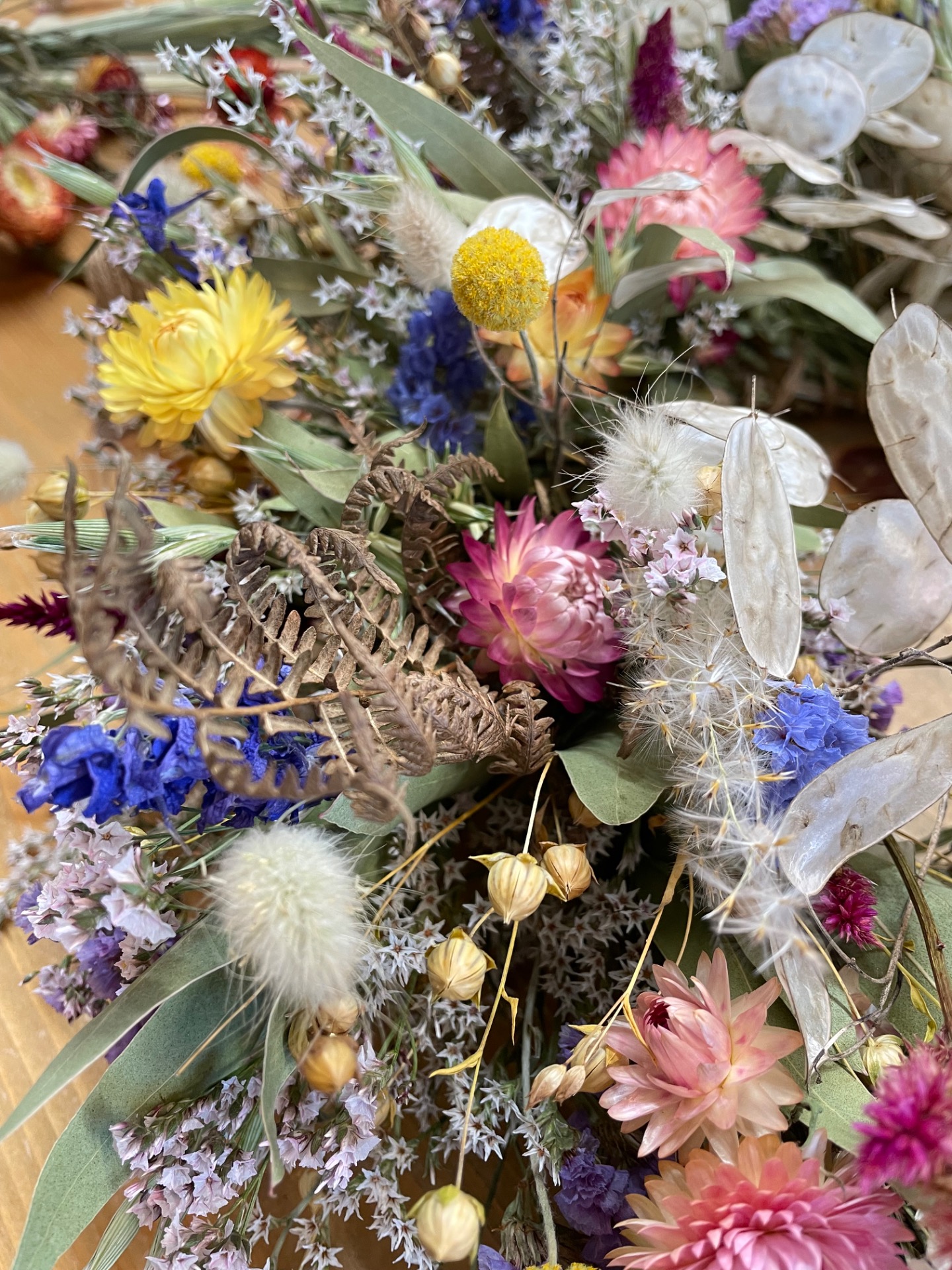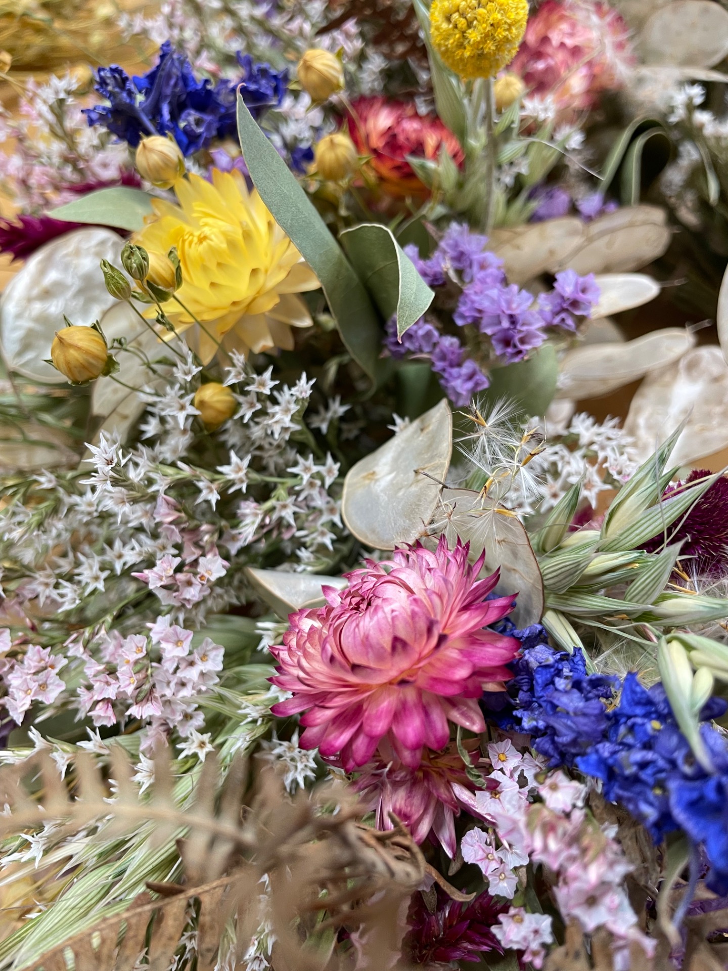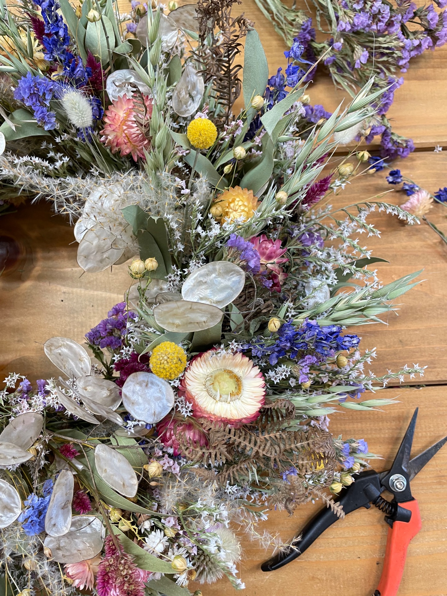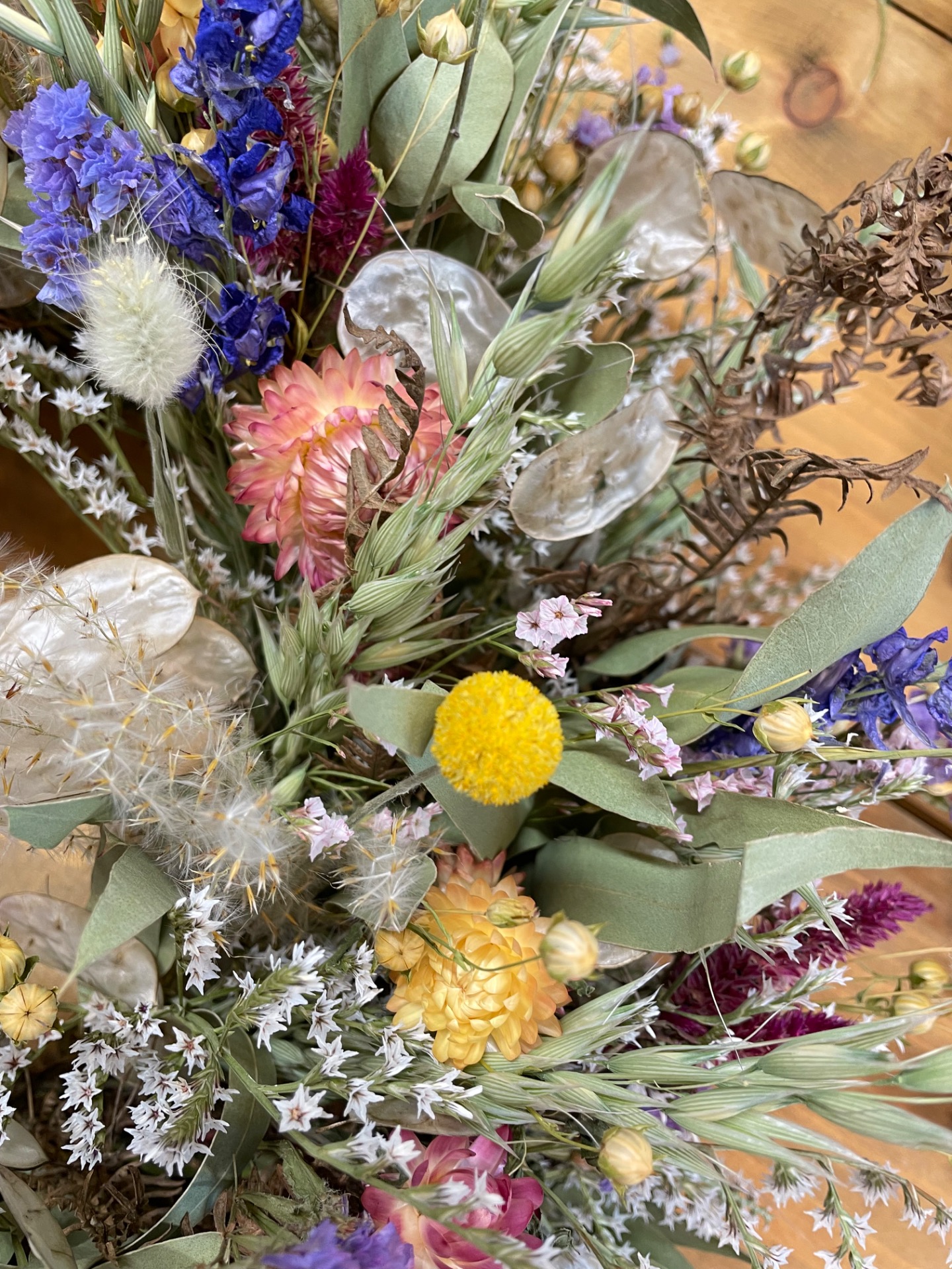 Prírodné rastliny: Použité rastliny vo venčeku sú vypestované na mojej kvetinovej farme a nazbierané v okolitej prírode. Každý kvet a vetvička je prirodzená, bez použitia umelých prvkov, farieb, či lepidiel. Nájdete v ňom tieto rastliny: limonku, slamienky, piesočník, kraspédiu, ostôžku, celóziu, ľan, papraď, mesačnicu ročnú, limonku tatársku, okrasnú trávu, zajačí chvostík, eukalyptus a ovos.