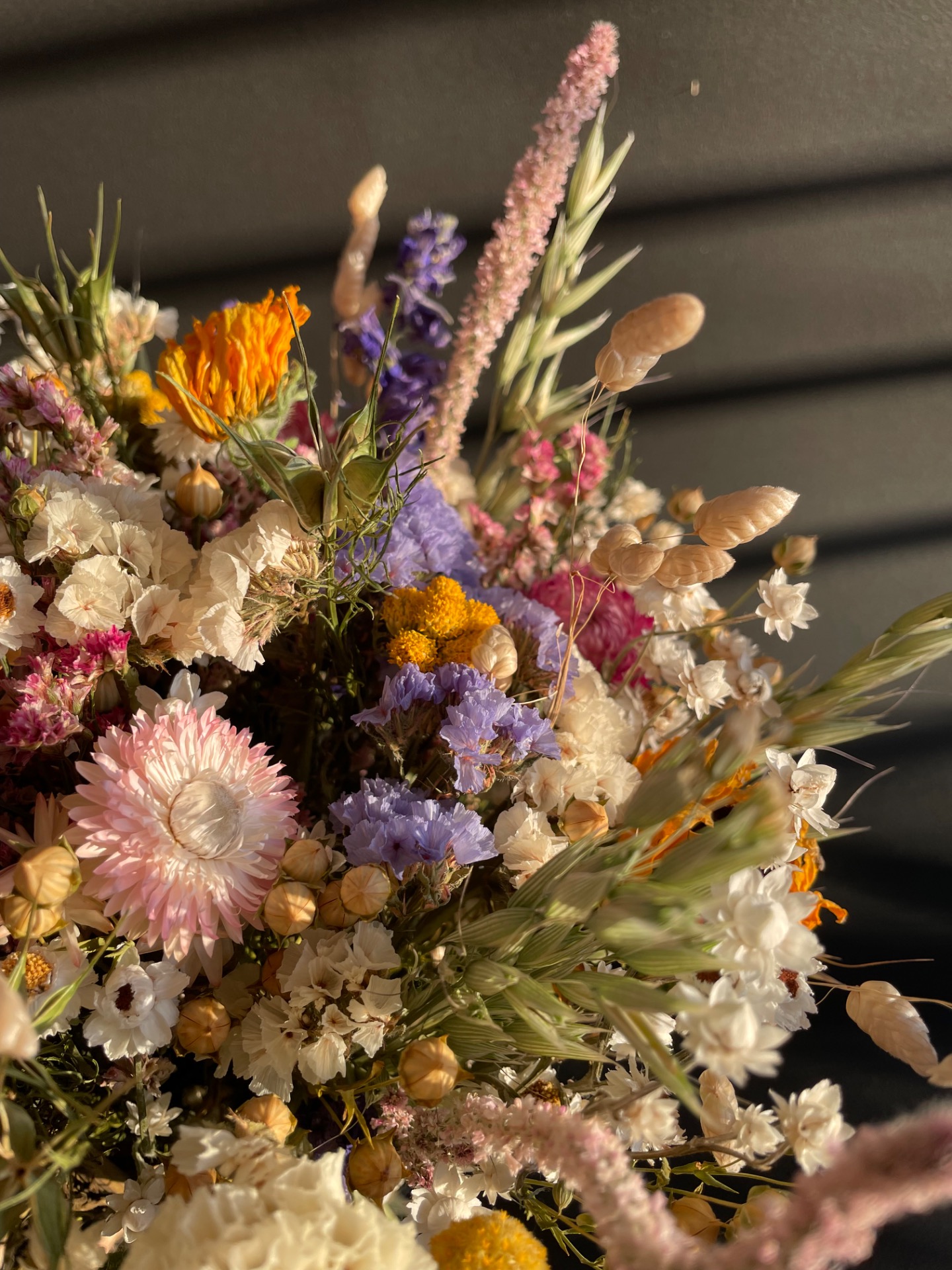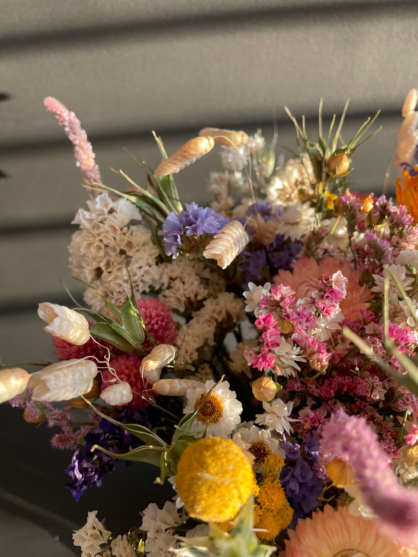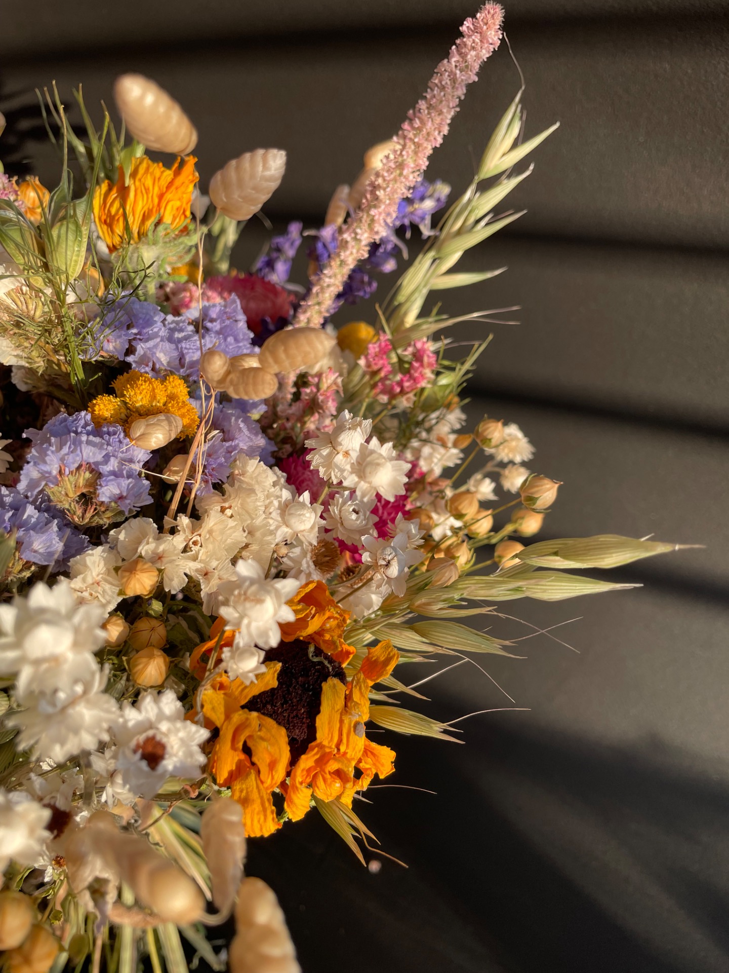 Všetky rastliny v kytici sú vypestované na mojej kvetinovej farme, alebo nazbierané v okolitej prírode. Počas pestovania a ani v priebehu ich spracovania, som nepoužívala žiadne postreky ani farbivá. Rastliny sú tak 100% prírodné. Je prirodzené, že rastliny majú drobné tvarové, rozmerové aj farebné odchýlky a dokonca aj nepatrné nedostatky. Tak to zariadila príroda.