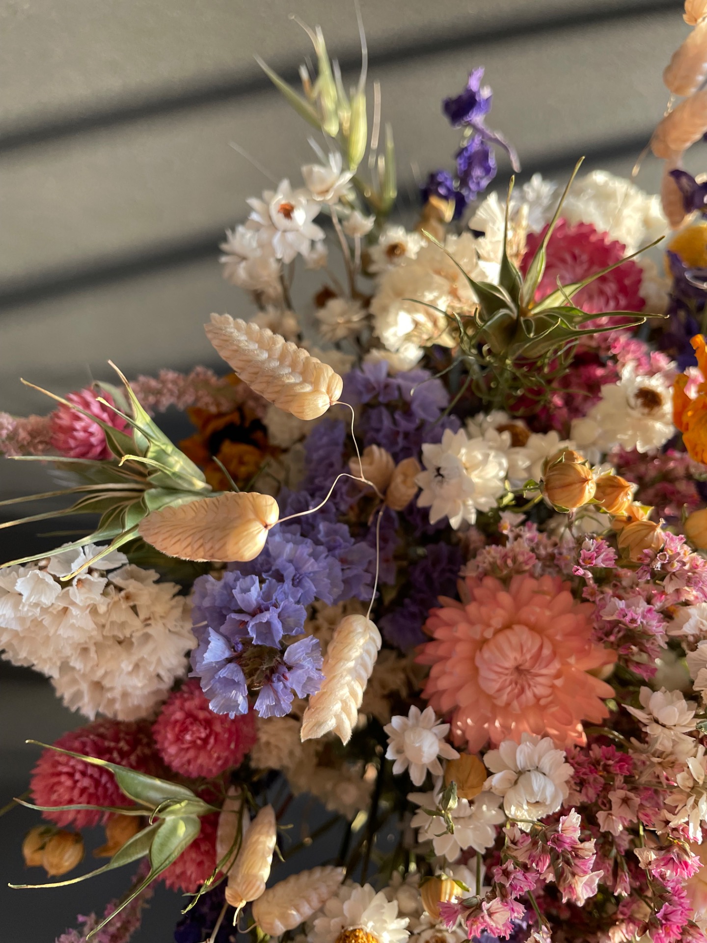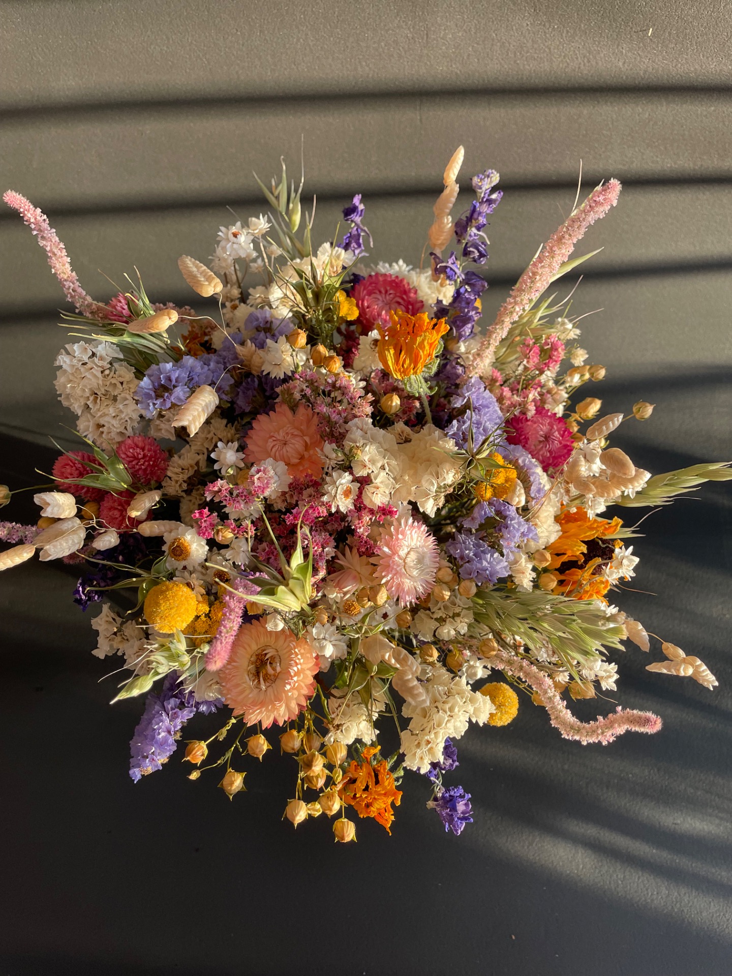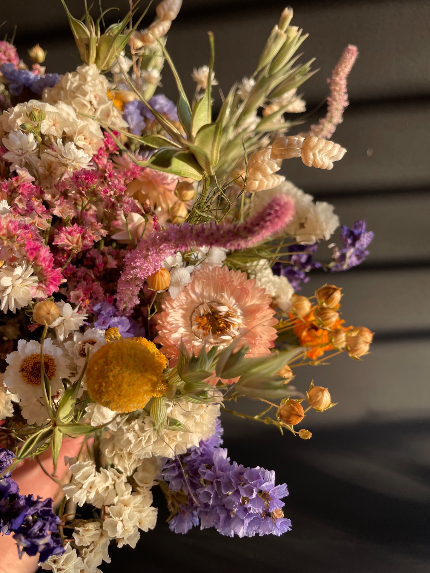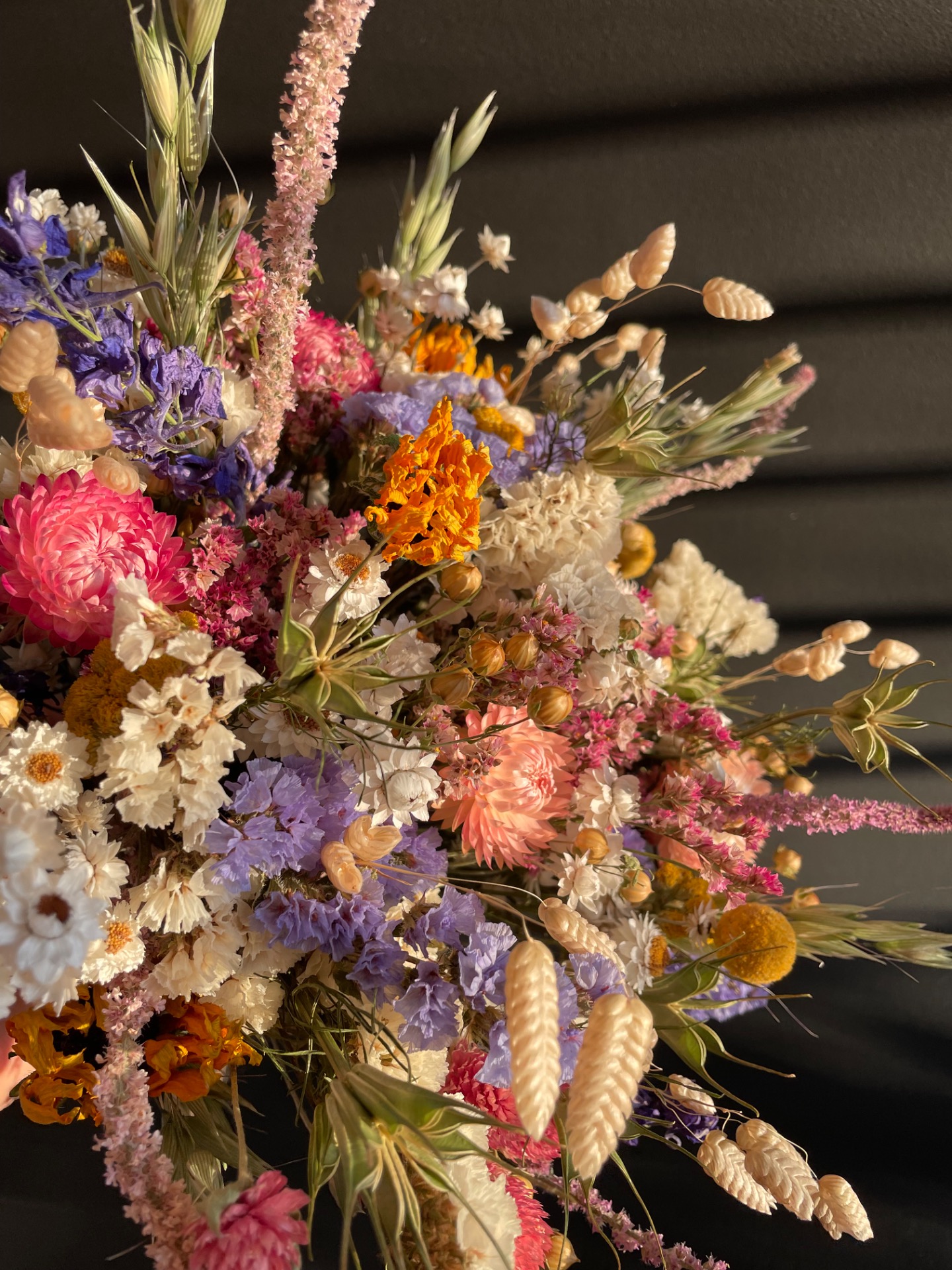 Všetky rastliny v kytici sú vypestované na mojej kvetinovej farme, alebo nazbierané v okolitej prírode. Počas pestovania a ani v priebehu ich spracovania, som nepoužívala žiadne postreky ani farbivá. Rastliny sú tak 100% prírodné. Je prirodzené, že rastliny majú drobné tvarové, rozmerové aj farebné odchýlky a dokonca aj nepatrné nedostatky. Tak to zariadila príroda.