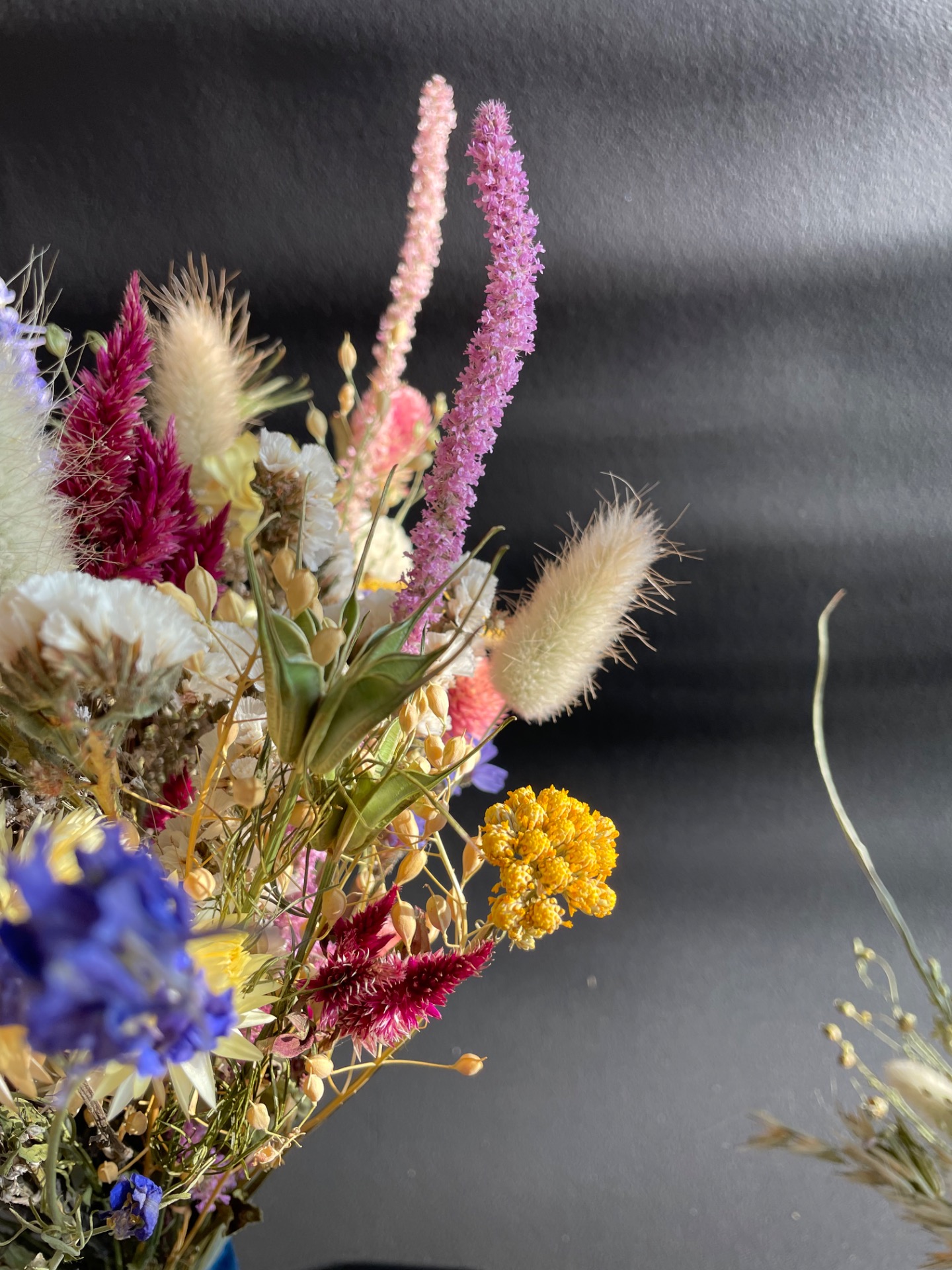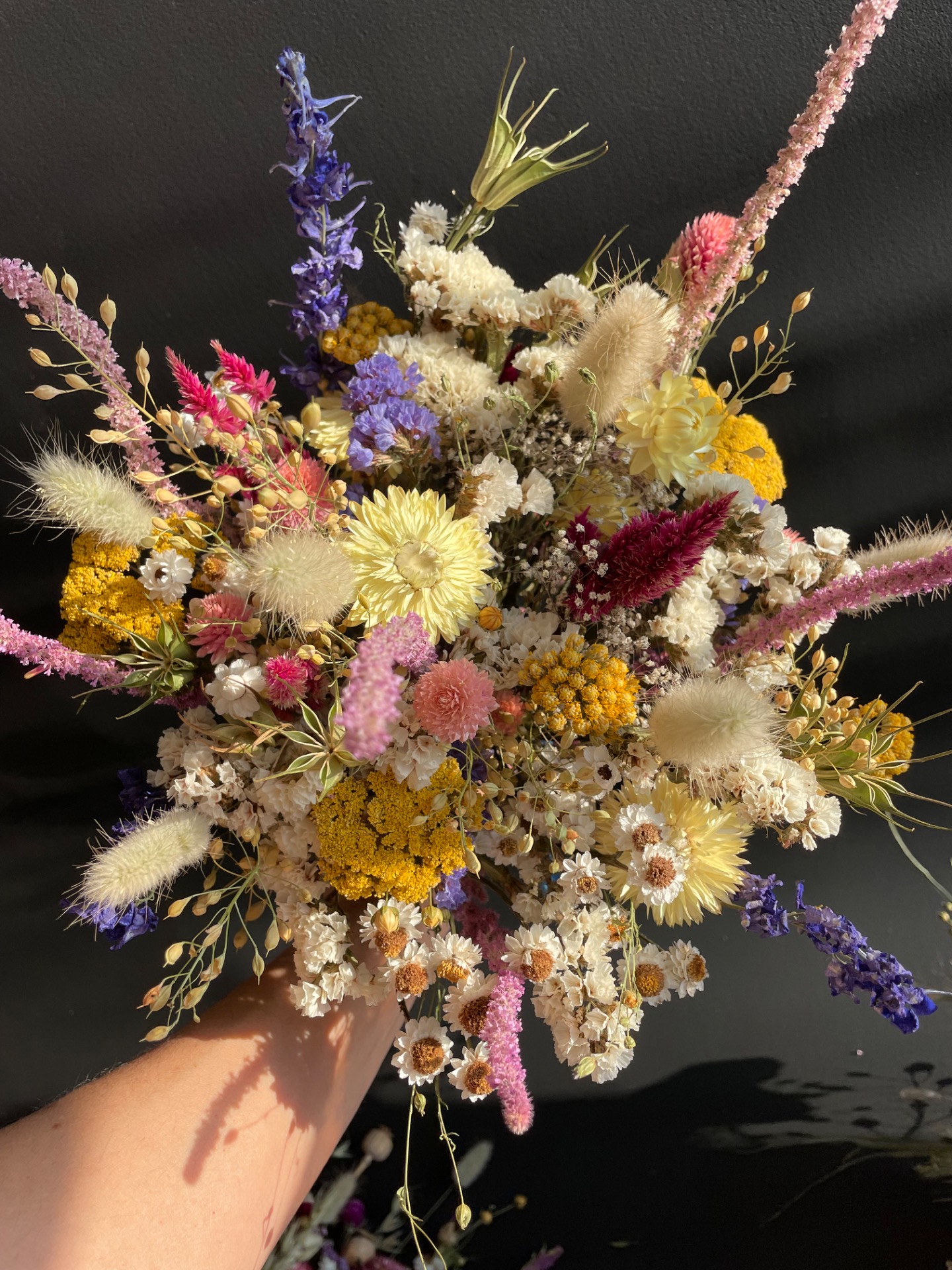Všetky rastliny v kytici sú vypestované na mojej kvetinovej farme, alebo nazbierané v okolitej prírode. Počas pestovania a ani v priebehu ich spracovania, som nepoužívala žiadne postreky ani farbivá. Rastliny sú tak 100% prírodné. Je prirodzené, že rastliny majú drobné tvarové, rozmerové aj farebné odchýlky a dokonca aj nepatrné nedostatky. Tak to zariadila príroda.