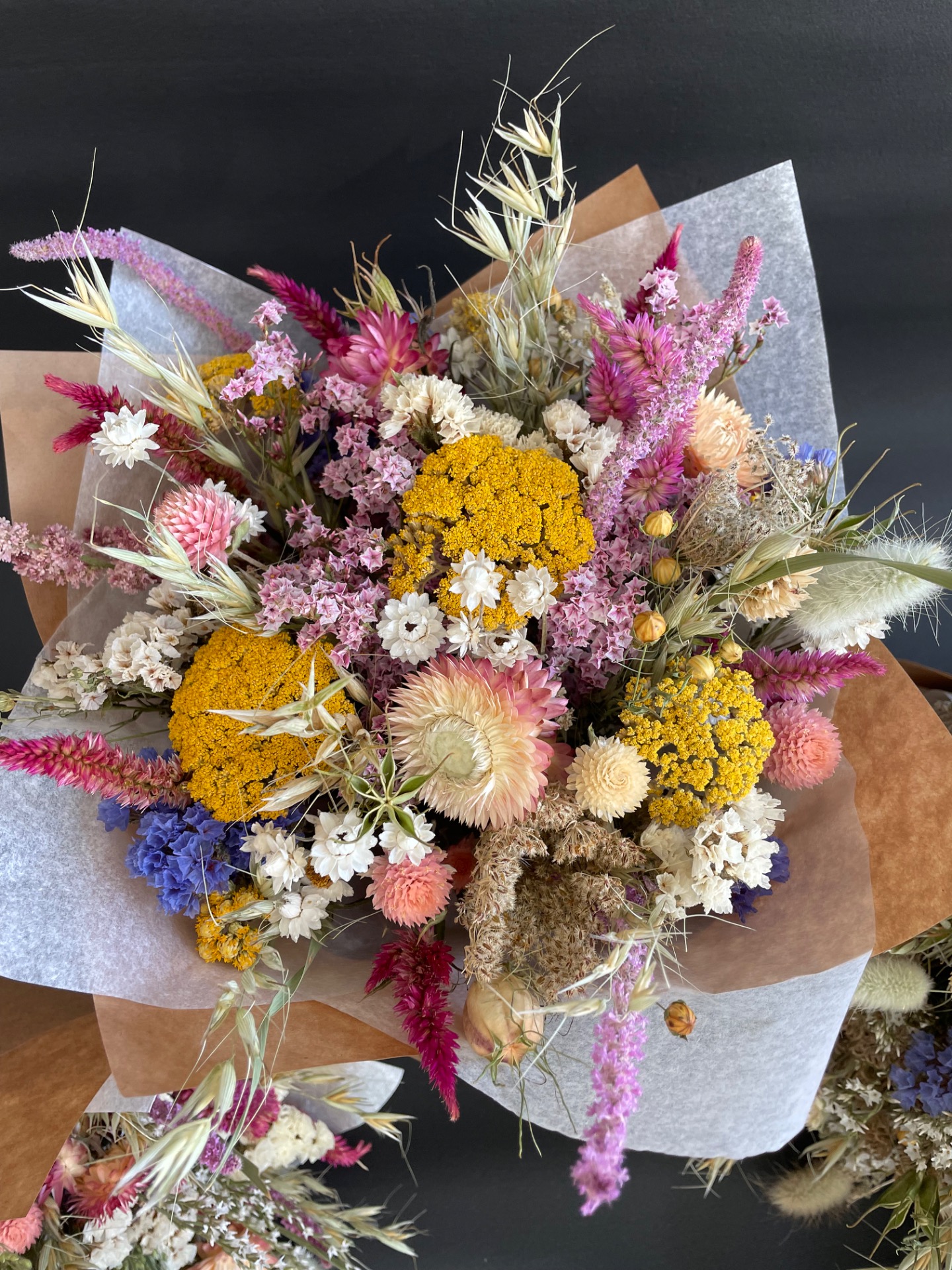 Všetky rastliny v kytici sú vypestované na mojej kvetinovej farme, alebo nazbierané v okolitej prírode. Počas pestovania a ani v priebehu ich spracovania, som nepoužívala žiadne postreky ani farbivá. Rastliny sú tak 100% prírodné. Je prirodzené, že rastliny majú drobné tvarové, rozmerové aj farebné odchýlky a dokonca aj nepatrné nedostatky. Tak to zariadila príroda.