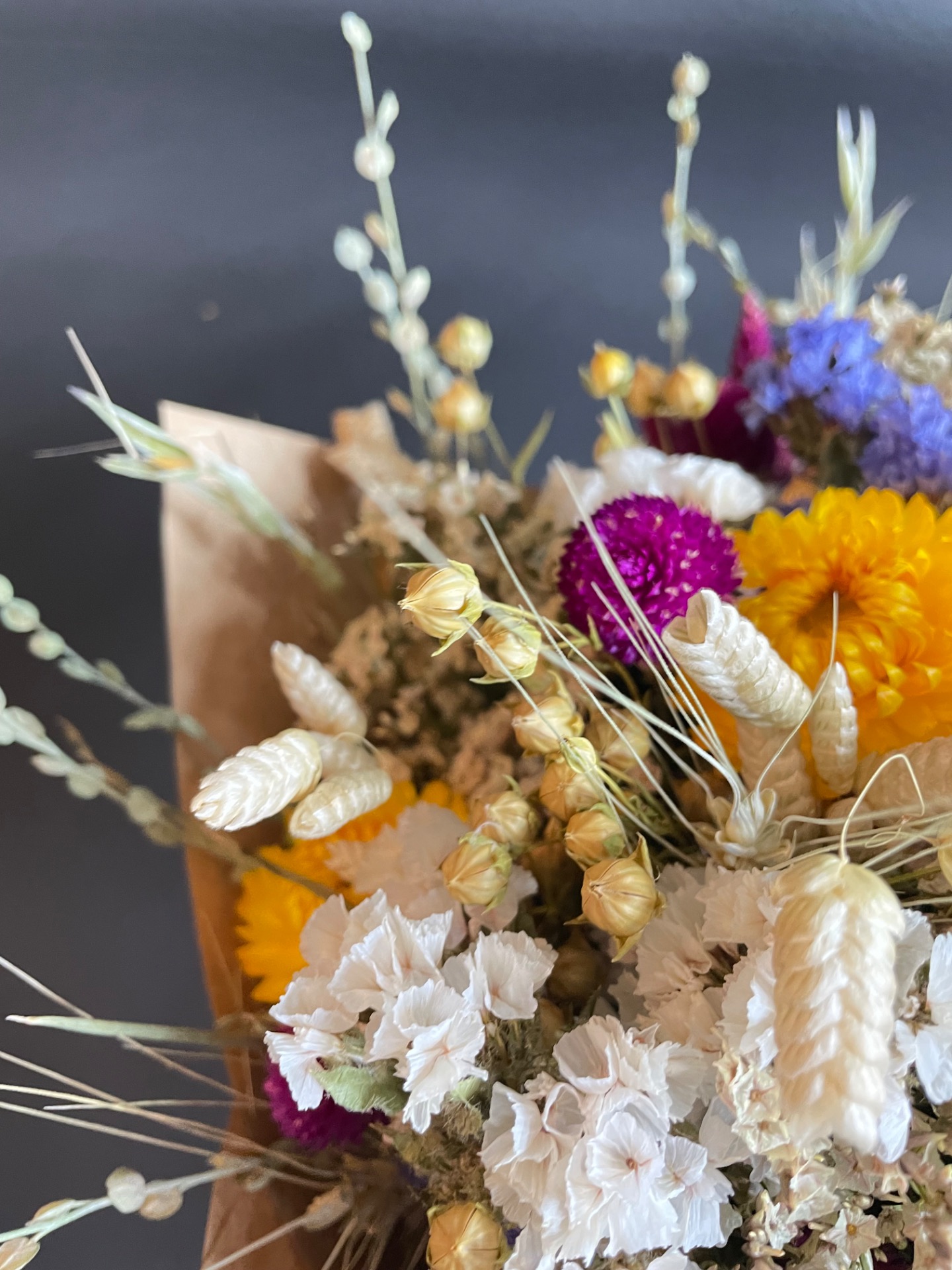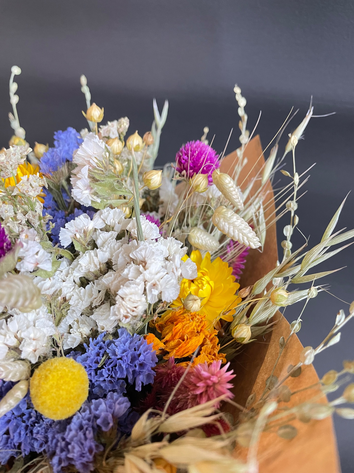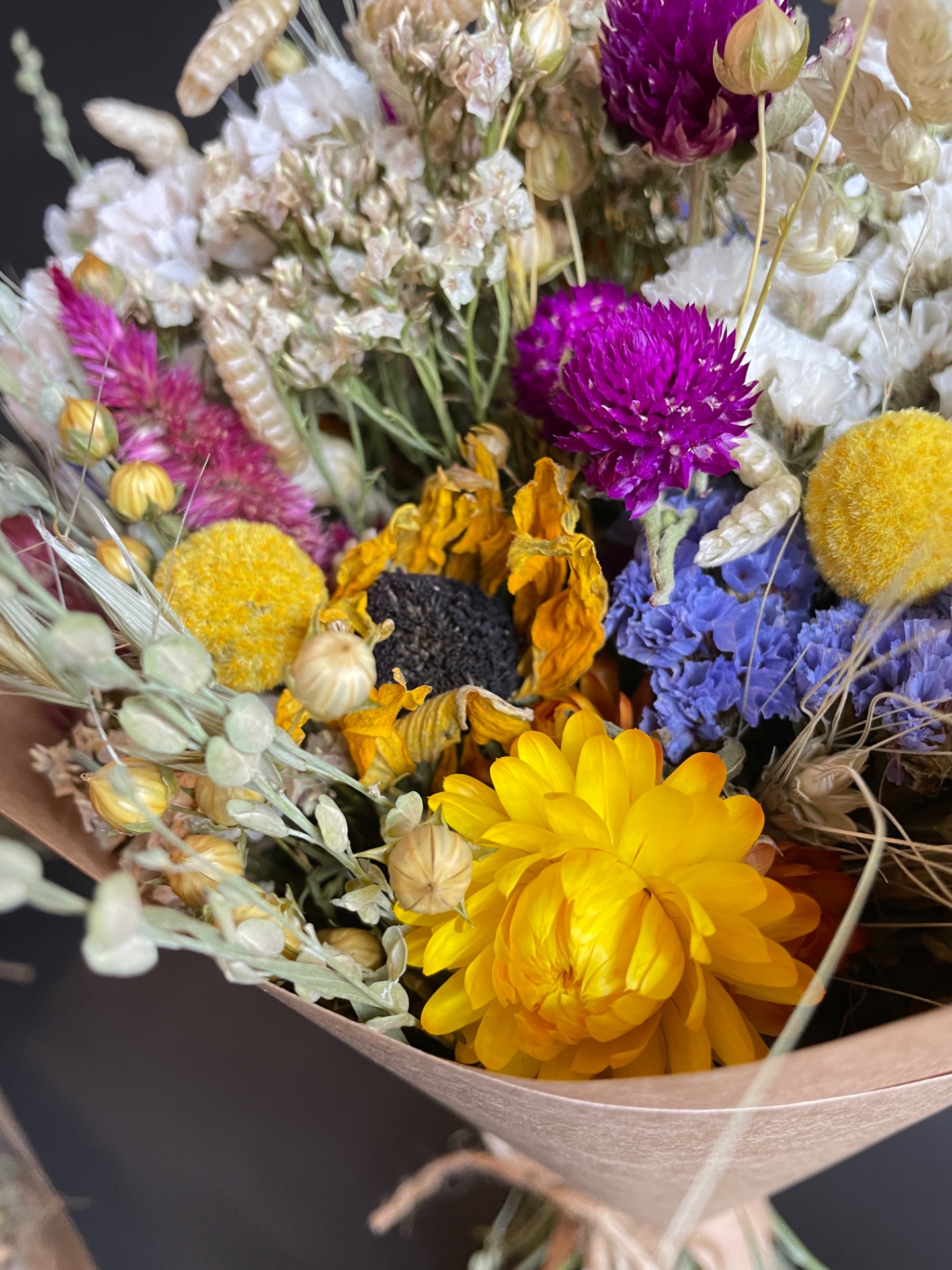 Všetky rastliny v kytici sú vypestované na mojej kvetinovej farme, alebo nazbierané v okolitej prírode. Počas pestovania a ani v priebehu ich spracovania, som nepoužívala žiadne postreky ani farbivá. Rastliny sú tak 100% prírodné. Je prirodzené, že rastliny majú drobné tvarové, rozmerové aj farebné odchýlky a dokonca aj nepatrné nedostatky. Tak to zariadila príroda.