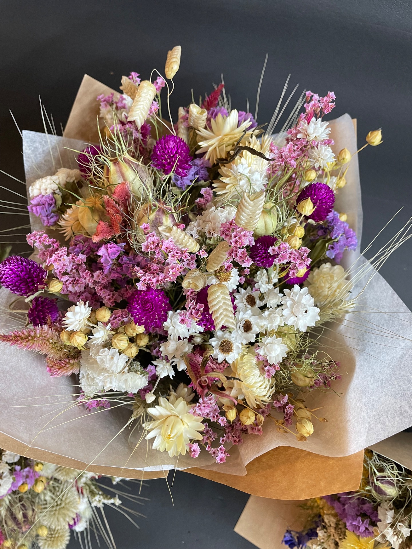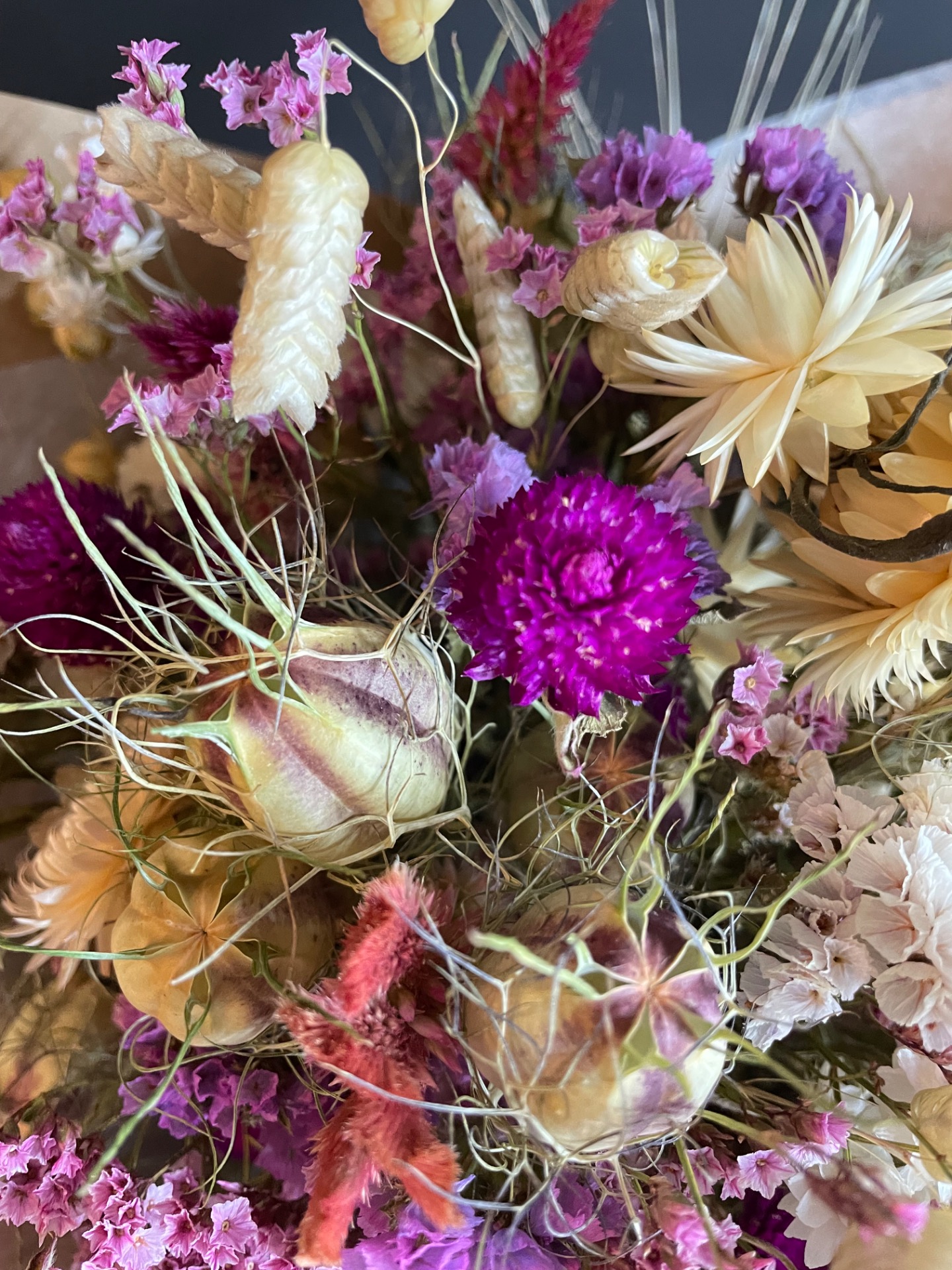 Všetky rastliny v kytici sú vypestované na mojej kvetinovej farme, alebo nazbierané v okolitej prírode. Počas pestovania a ani v priebehu ich spracovania, som nepoužívala žiadne postreky ani farbivá. Rastliny sú tak 100% prírodné. Je prirodzené, že rastliny majú drobné tvarové, rozmerové aj farebné odchýlky a dokonca aj nepatrné nedostatky. Tak to zariadila príroda.