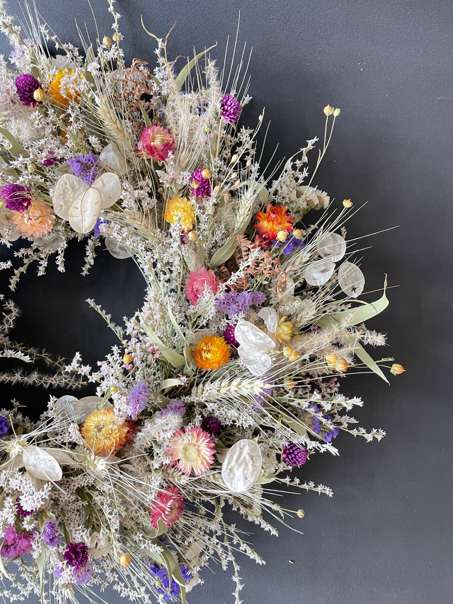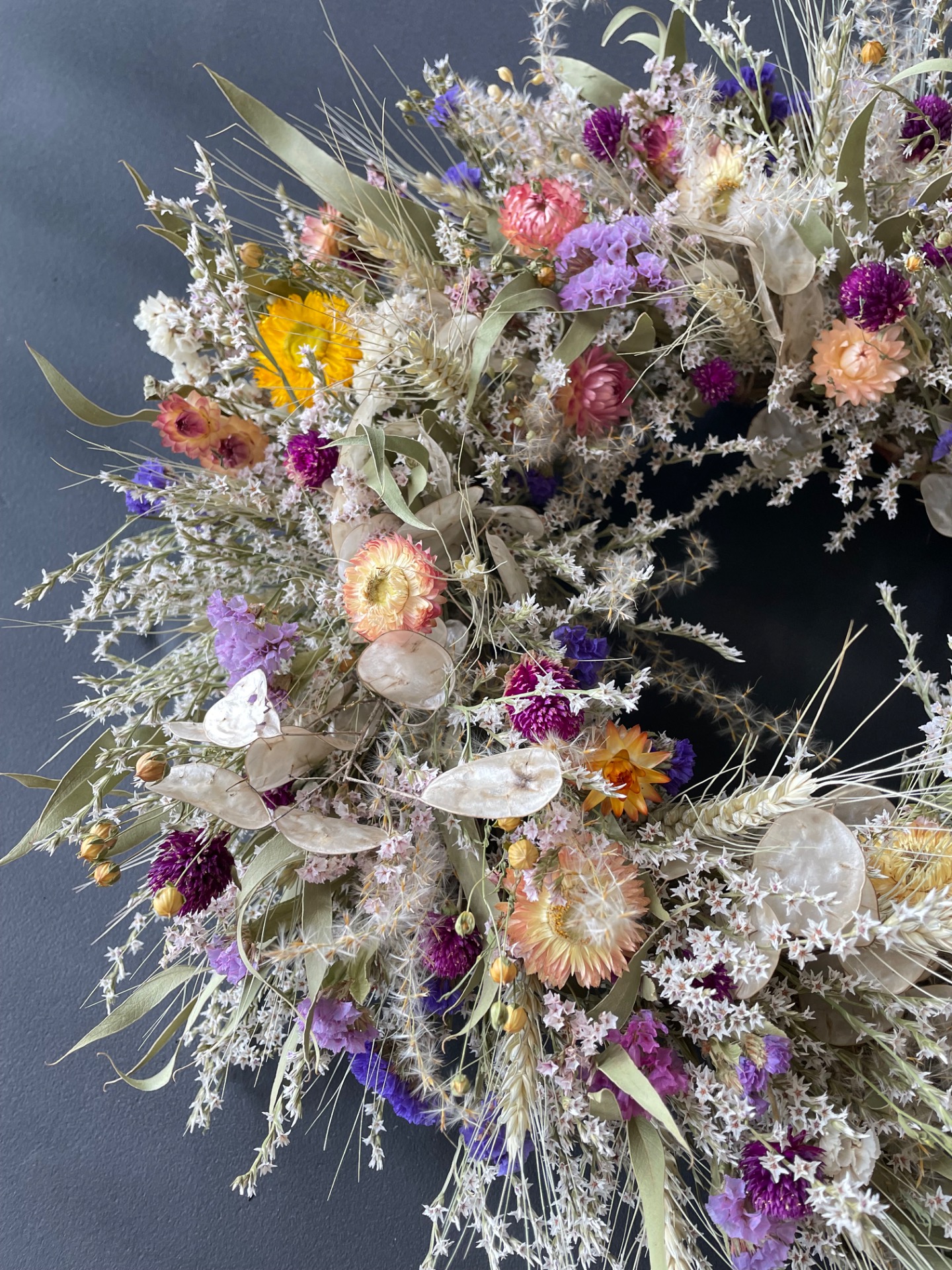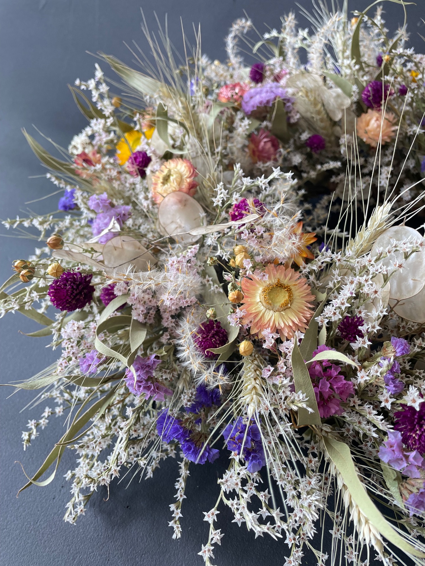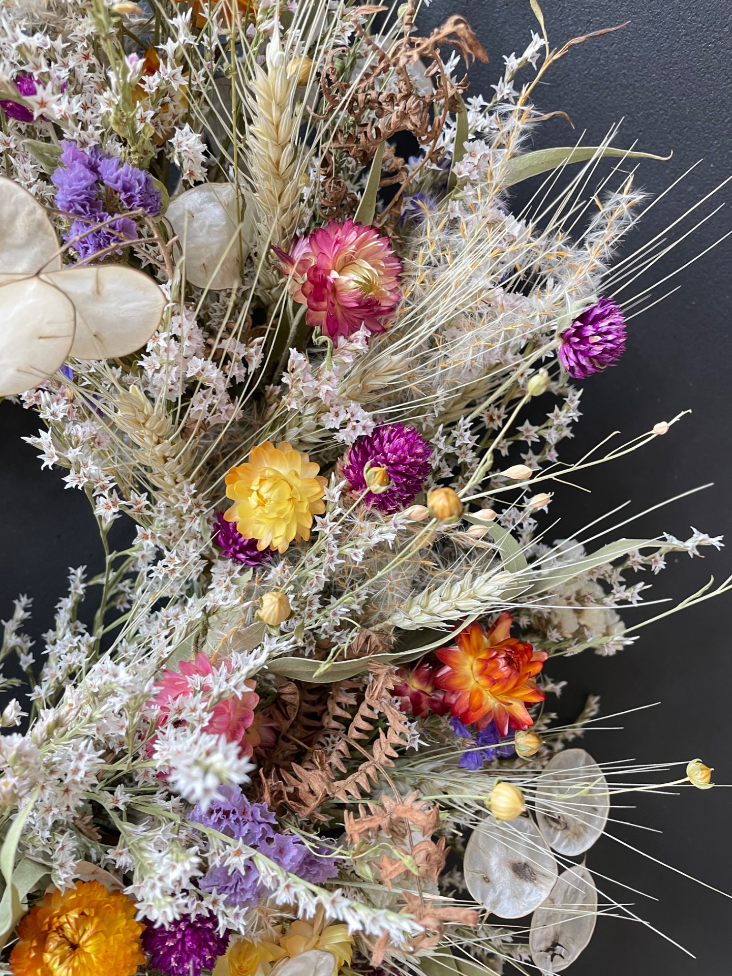 Prírodné rastliny: Použité rastliny vo venčeku sú vypestované na mojej kvetinovej farme a nazbierané v okolitej prírode. Každý kvet a vetvička je prirodzená, bez použitia umelých prvkov, farieb, či lepidiel. Nájdete v ňom tieto rastliny: limonku, slamienky, limonku tatársku, obilie, ľan, okrasné trávy, papraď, mesčnicu ročnú, eukalyptus a limonku japonskú.