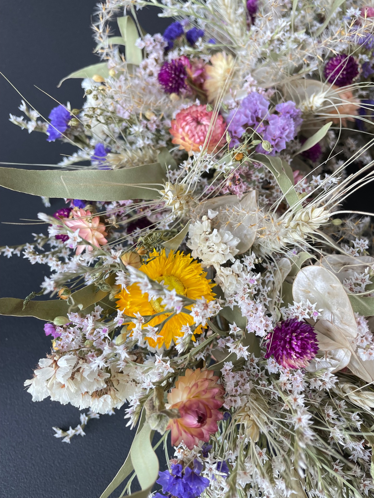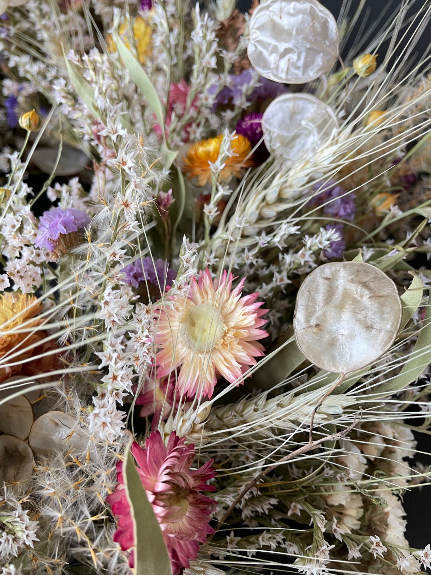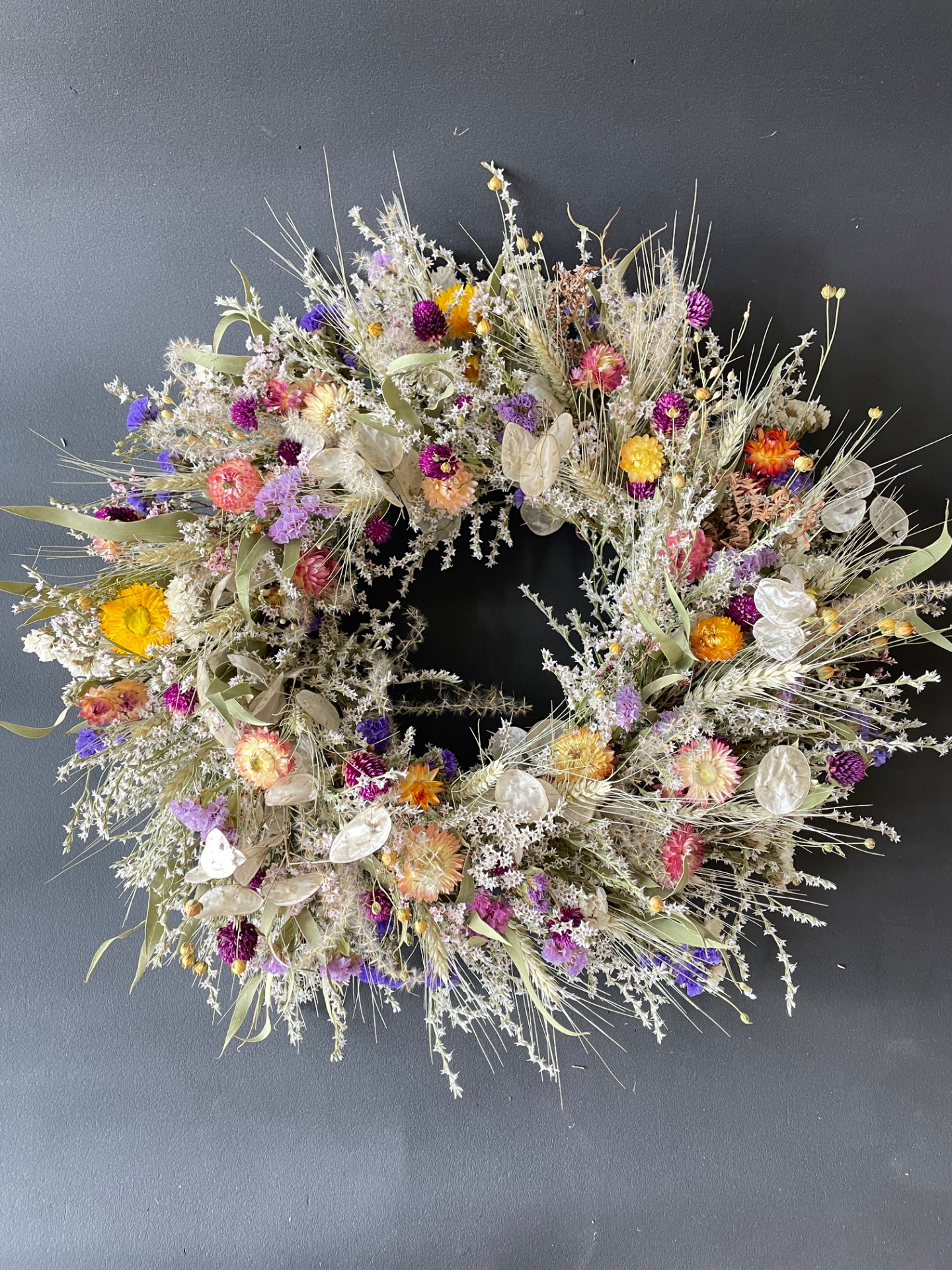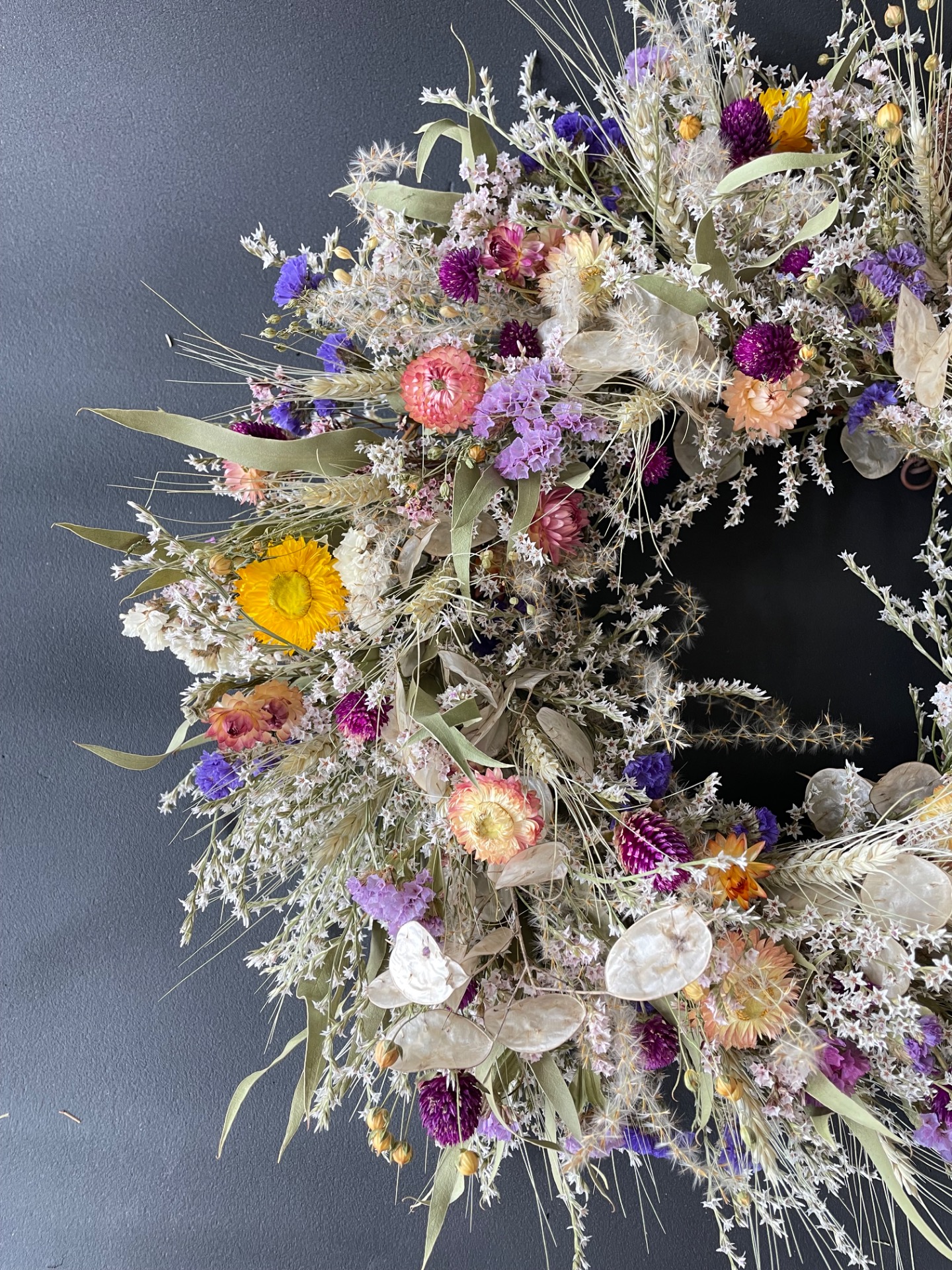 Prírodné rastliny: Použité rastliny vo venčeku sú vypestované na mojej kvetinovej farme a nazbierané v okolitej prírode. Každý kvet a vetvička je prirodzená, bez použitia umelých prvkov, farieb, či lepidiel. Nájdete v ňom tieto rastliny: limonku, slamienky, limonku tatársku, obilie, ľan, okrasné trávy, papraď, mesčnicu ročnú, eukalyptus a limonku japonskú.