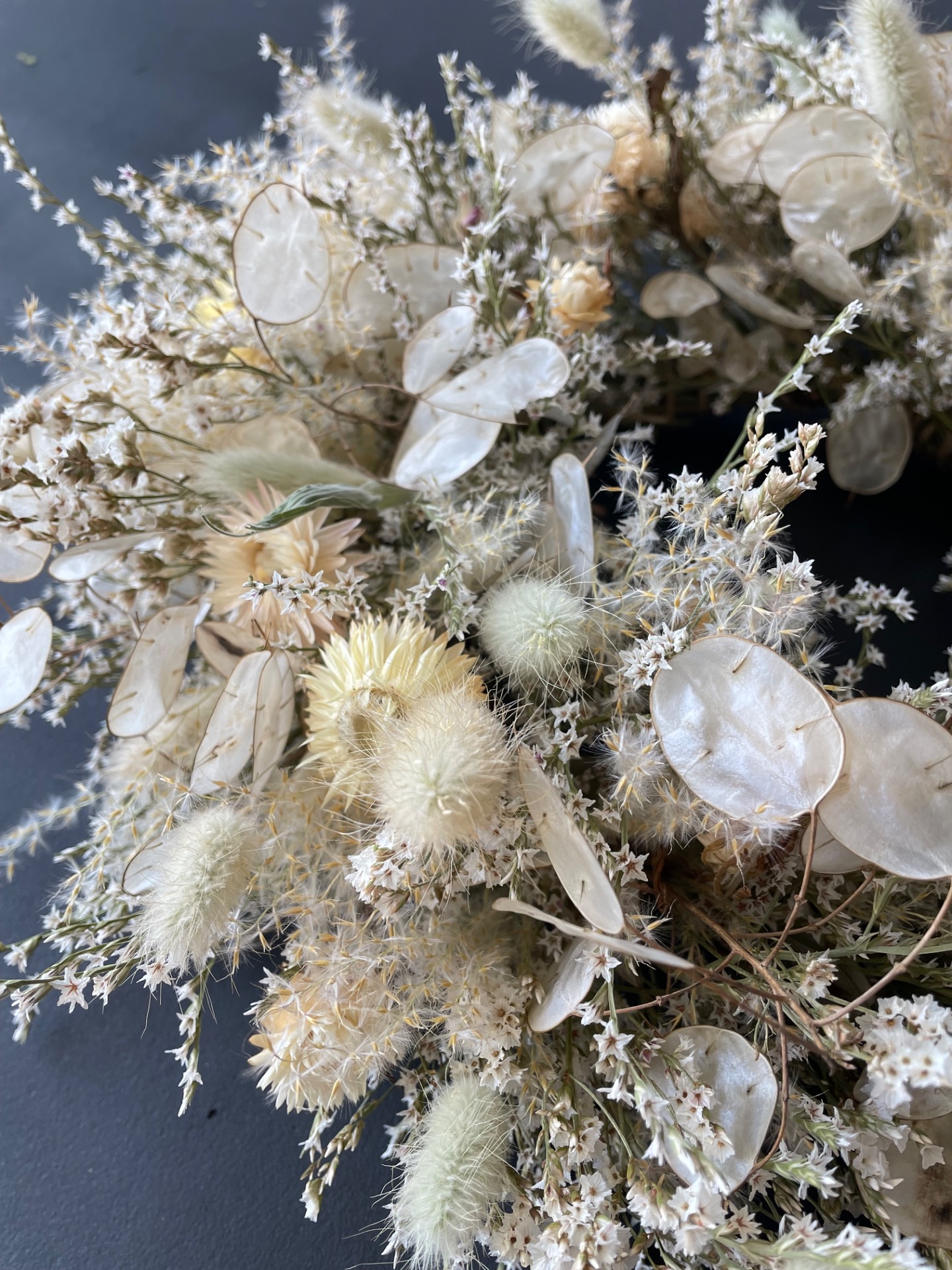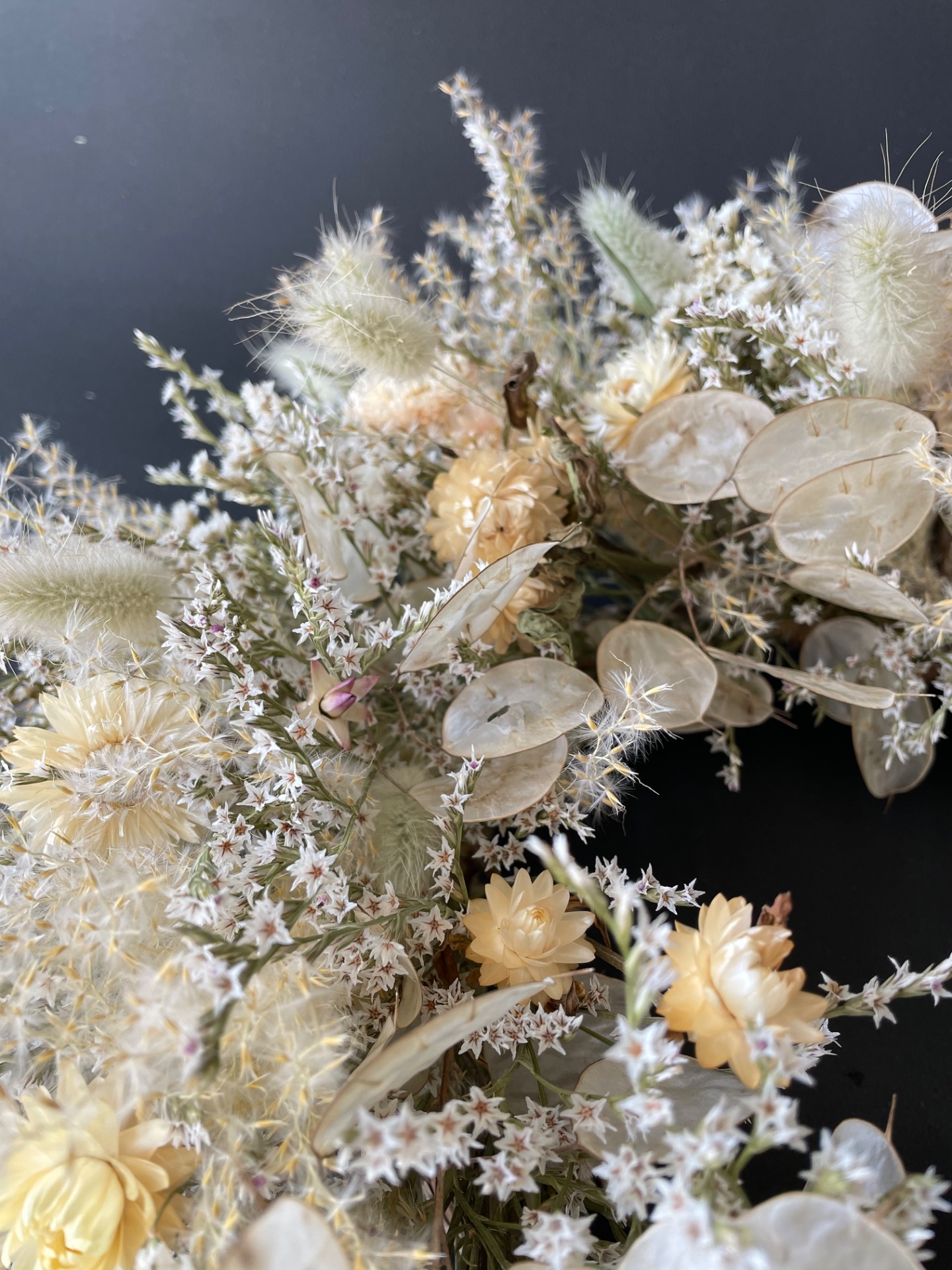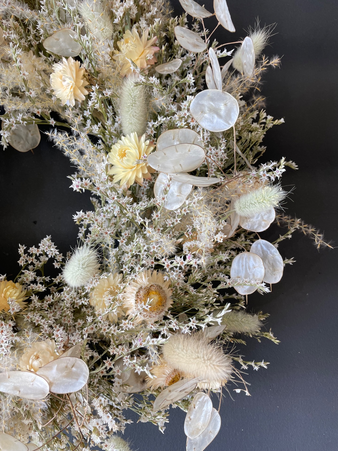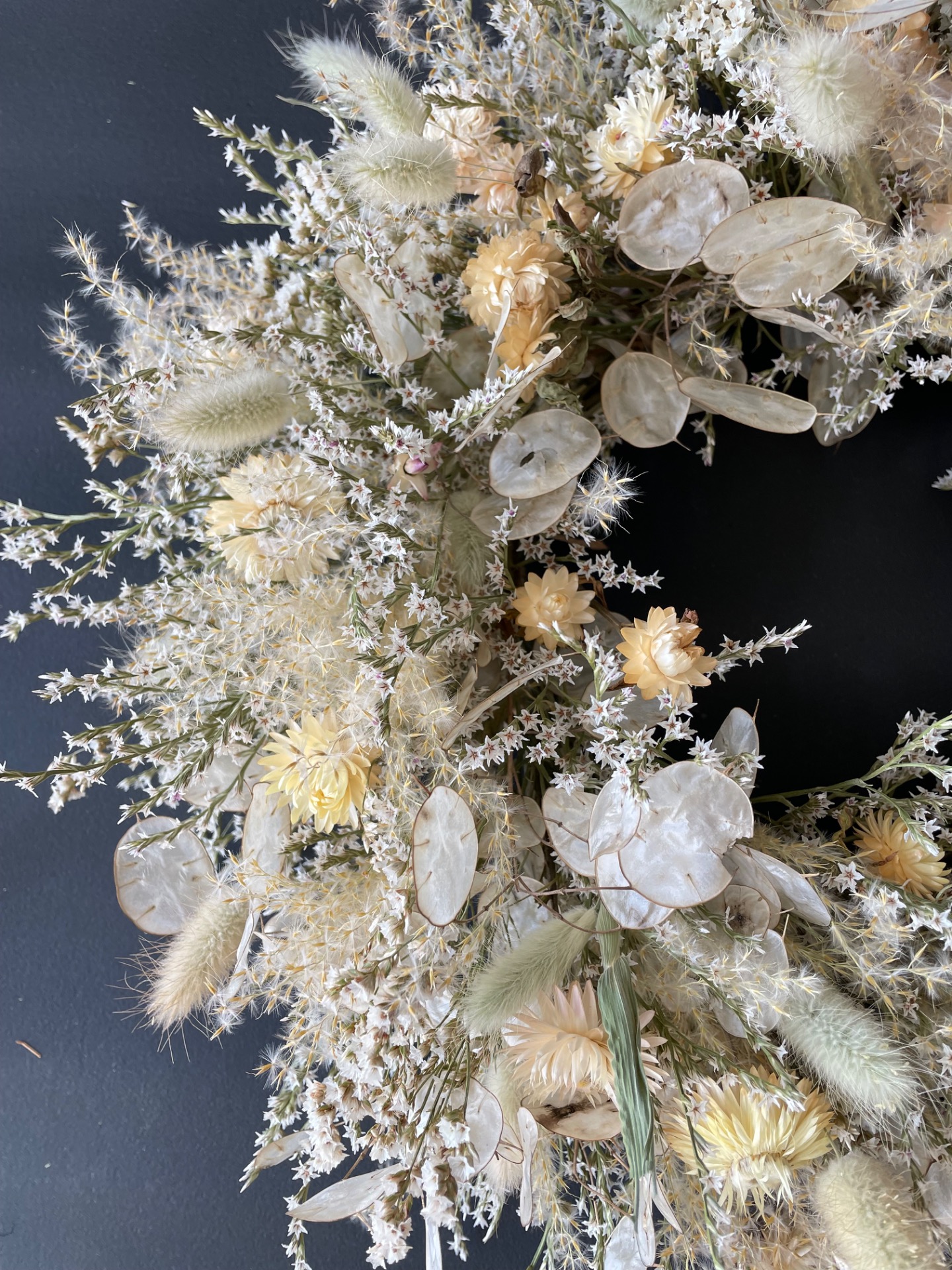 Prírodné rastliny: Použité rastliny vo venčeku sú vypestované na mojej kvetinovej farme a nazbierané v okolitej prírode. Každý kvet a vetvička je prirodzená, bez použitia umelých prvkov, farieb, či lepidiel. Nájdete v ňom tieto rastliny: slamienky, limonku tatársku, okrasné trávy, mesčnicu ročnú a limonku japonskú.